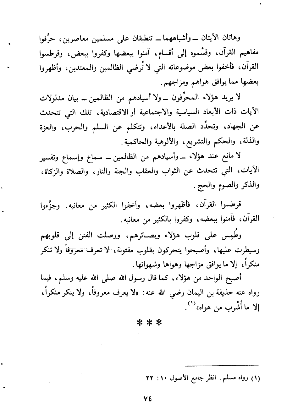 أصبح الواحد من هؤلاء، كما قال رسول الله صلى الله عليه وسلم، فيما رواه عنه حذيفة بن اليمان رضي الله عنه: " لا يعرف معروفاً، ولا ينكر منكراً، إلا ما أُشْرب من هواه " (1).