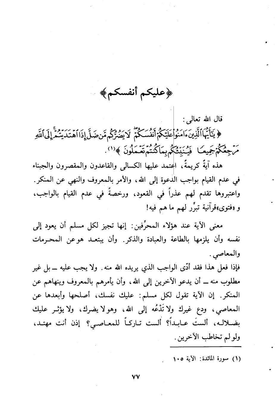 فإذا فعل هذا فقد أدّى الواجب الذي يريده الله منه. ولا يجب عليه -بل غير مطلوب منه- أن يدعو الآخرين إلى الله، وأن يأمرهم بالمعروف وينهاهم عن المنكر. إن الآية تقول لكل مسلم: عليك نفسك، أصلحها وأبعدها عن المعاصي، ودع غيرك ولا تَدْعُه إلى الله، وهو لا يضرك، ولا يؤثر عليك بضلاله، ألستَ عابداً؟ ألست تاركاً للمعاصي؟ إذن أنت مهتد، ولو لم تخاطب الآخرين.