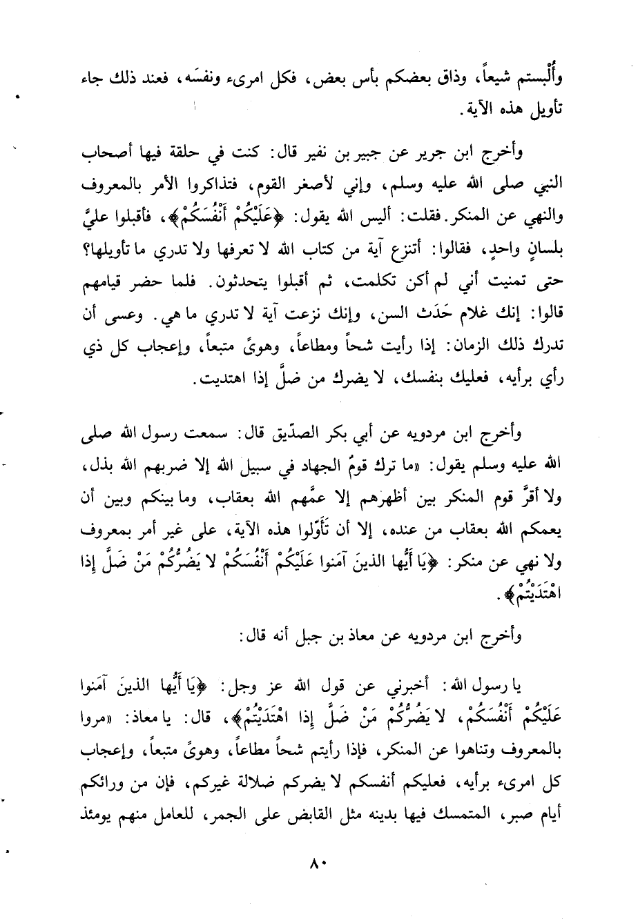 وأخرج ابن جرير عن جبير بن نفير قال: كنت في حلقة فيها أصحاب النبي صلى الله عليه وسلم، وإني لأصغر القوم، فتذاكروا الأمر بالمعروف والنهي عن المنكر. فقلت: أليس الله يقول: {عَلَيْكُمْ أَنْفُسَكُمْ}، فأقبلوا عليَّ بلسانٍ واحدٍ، فقالوا: أتنزع آية من كتاب الله لا تعرفها ولا تدري ما تأويلها؟ حتى تمنيت أني لم أكن تكلمت، ثم أقبلوا يتحدثون. فلما حضر قيامهم قالوا: إنك غلام حَدَث السن، وإنك نزعت آية لا تدري ما هي. وعسى أن تدرك ذلك الزمان: إذا رأيت شحاً ومطاعاً، وهوًى متبعاً، وإعجاب كل ذي رأي برأيه، فعليك بنفسك، لا يضرك من ضلَّ إذا اهتديت.