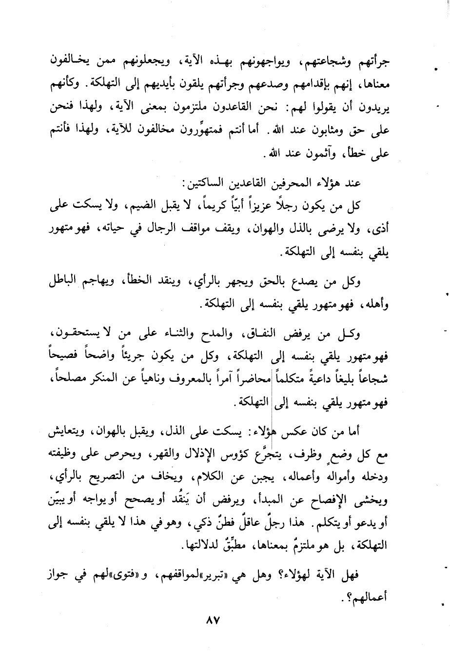 جرأتهم وشجاعتهم، ويواجهونهم بهذه الآية، ويجعلونهم ممن يخالفون معناها، إنهم بإقدامهم وصدعهم وجرأتهم يلقون بأيديهم إلى التهلكة. وكأنهم يريدون أن يقولوا لهم: نحن القاعدون ملتزمون بمعنى الآية، ولهذا فنحن على حق ومثابون عند الله. أما أنتم فمتهوِّرون مخالفون للآية، ولهذا فأنتم على خطأ، وآثمون عند الله.