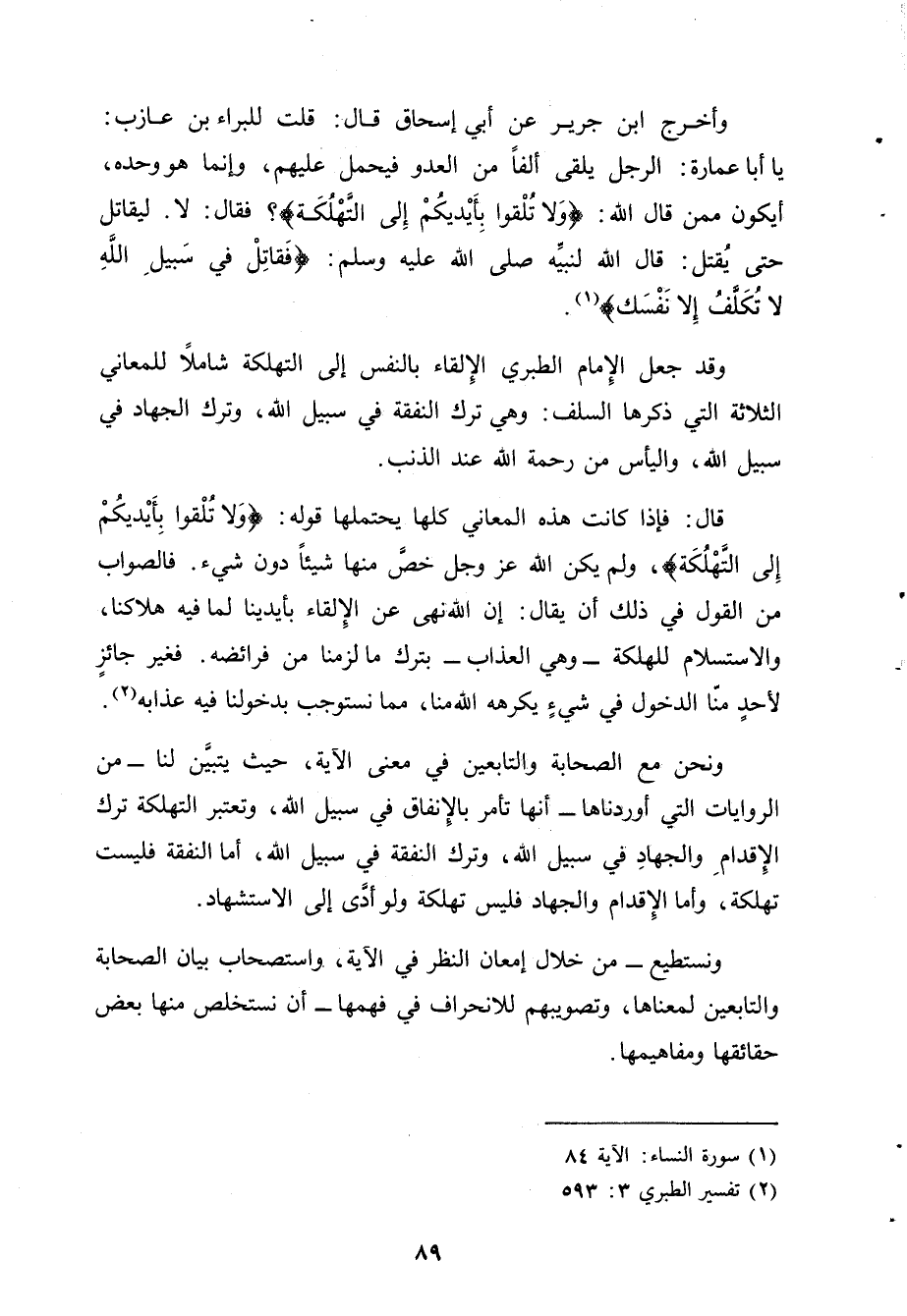 وأخرج ابن جرير عن أبي إسحاق قال: قلت للبراء بن عازب: يا أبا عمارة: الرجل يلقى ألفاً من العدو فيحمل عليهم، وإنما هو وحده، أيكون ممن قال الله: {وَلا تُلْقُوا بِأَيْدِيكُمْ إِلَى التَّهْلُكَةِ}؟ فقال: لا. ليقاتل حتى يُقتل: قال الله لنبيه صلى الله عليه وسلم: {فَقاتِلْ في سَبيلِ اللهِ لا تكَلَّفُ إلا نَفْسَك}.