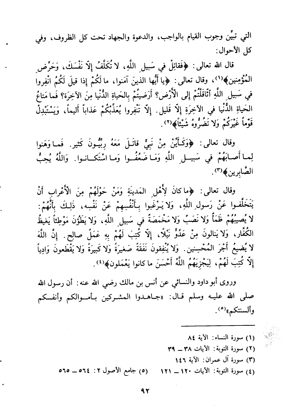قال الله تعالى: {فَقَاتِلْ فِي سَبِيلِ اللهِ لا تُكَلَّفُ إِلَّا نَفْسَكَ وَحَرِّضِ الْمُؤْمِنِينَ}، وقال تعالى: {يَا أَيُّهَا الَّذِينَ آمَنُوا مَا لَكُمْ إِذَا قِيلَ لَكُمُ انْفِرُوا فِي سَبِيلِ اللهِ اثَّاقَلْتُمْ إِلَى الأرْضِ أَرَضِيتُمْ بِالْحَيَاةِ الدُّنْيَا مِنَ الْآخِرَةِ فَمَا مَتَاعُ الْحَيَاةِ الدُّنْيَا فِي الْآخِرَةِ إِلَّا قَلِيلٌ (38) إِلَّا تَنْفِرُوا يُعَذِّبْكُمْ عَذَابًا أَلِيمًا وَيَسْتَبْدِلْ قَوْمًا غَيْرَكُمْ وَلا تَضُرُّوهُ شَيْئًا}.