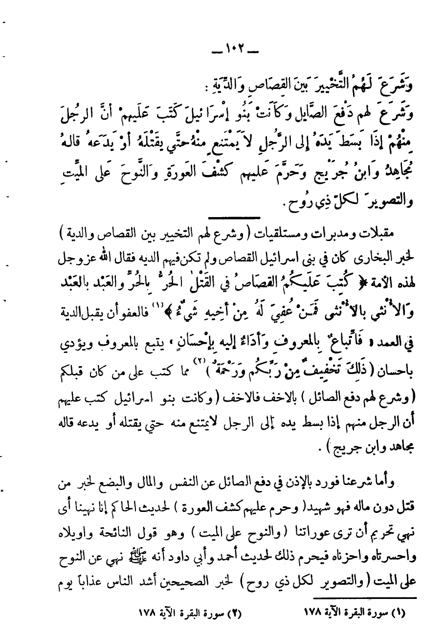وشُرعَ لهم التخيير بين القصاص والدية، وشُرعَ لهم دفع الصائل وكانت بنو إسرائيل كتب عليهم إذا الرجل بسط يده إلى الرجل لا يمتنع منه حتى يقتله أو يدعه، قاله مجاهد وابن جريج.