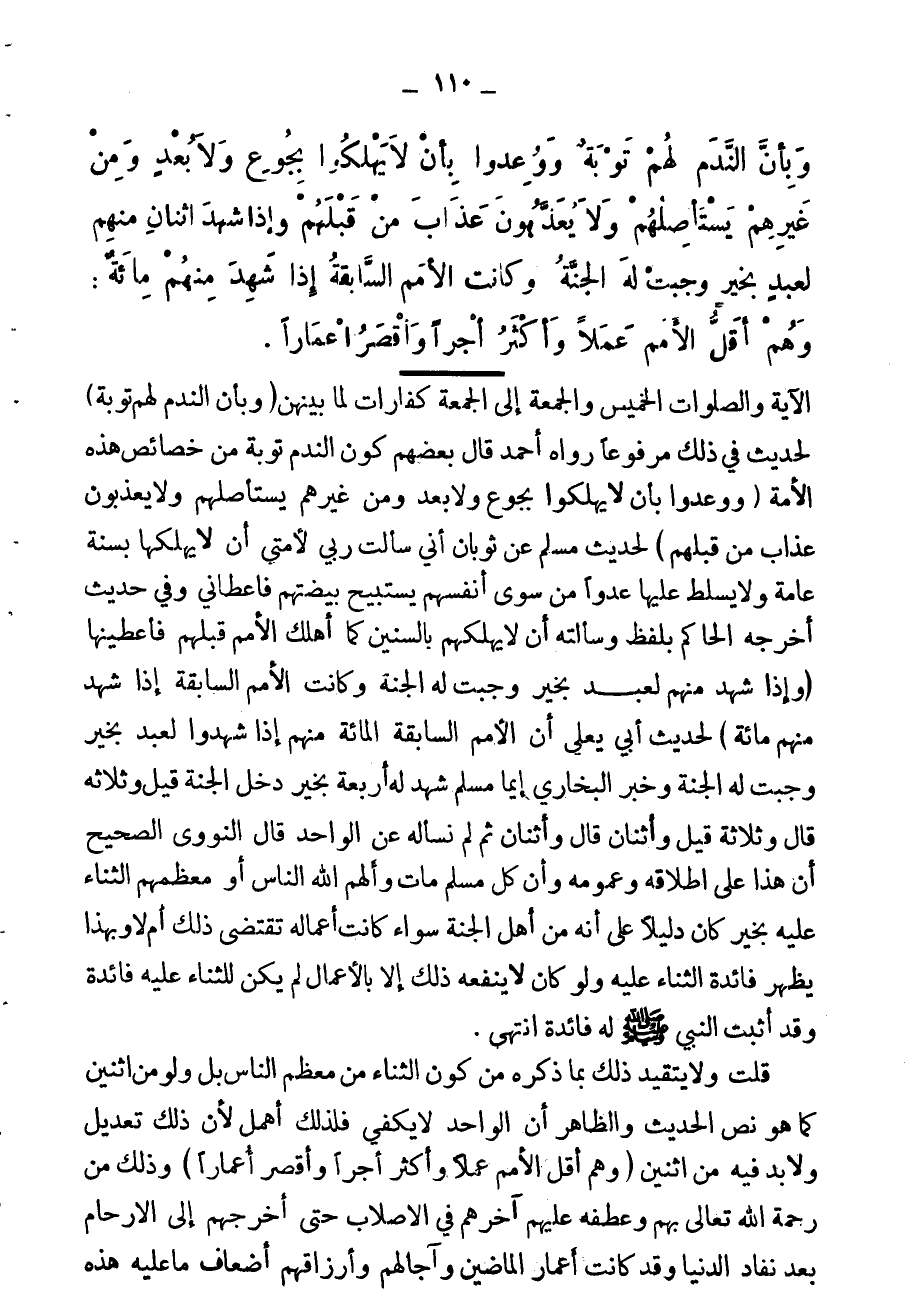 ووُعِدوا أن لا يهلكوا بجوع ولا بعَدوّ من غيرهم يستأصلهم، ولا بغرق، ولا يعذبوا بعذاب عذب به من قبلهم، وإذا شهد الاثنان منهم لعبد بخير وجبت له الجنة، وكانت الأمم السابقة إذا شهد منهم مئة.