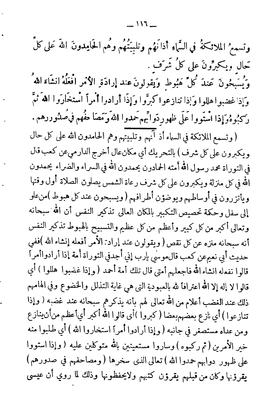 وهم الحامدون لله على كل حال، ويكبرون على كل شرف، ويسبحون عند كل هبوط، ويقولون عند إرادة الأمر: أفعله إن شاء الله، وإذا غضبوا هللوا، وإذا تنازعوا سبحوا، وإذا أرادوا استخاروا الله ثم ركبوا، وإذا ركبوا على ظهور دوابهم حمدواالله، ومصاحفهم في صدورهم،