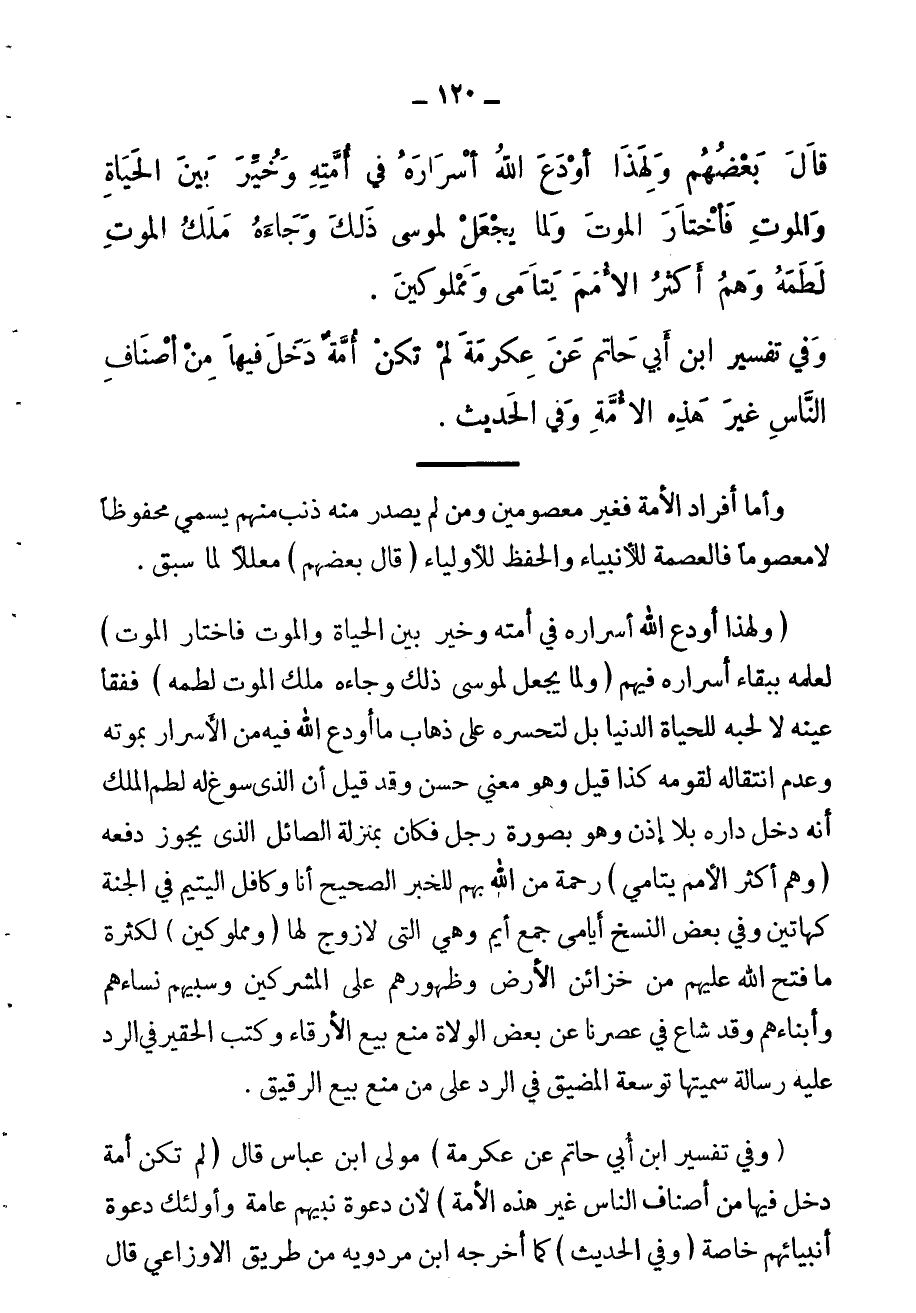 قال بعضهم: ولهذا لما أودع أسراره وخُيِّر بين الحياة والموت، اختار الموت. ولما لم يحصل لموسى ذلك، وجاءه ملك الموت لطمه. وهم أكثر الأمم أيامى ومملوكين، وفي "تفسير ابن أبي حاتم" عن عكرمة قال: لم تكن أمة دخل فيها من أصناف الناس غير هذه الأمة.
