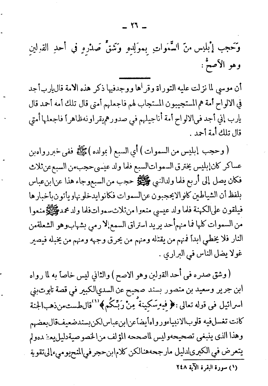 وحجب إبليس من السموات لمولده وشق صدره في أحد القولين، وهو الأصح،