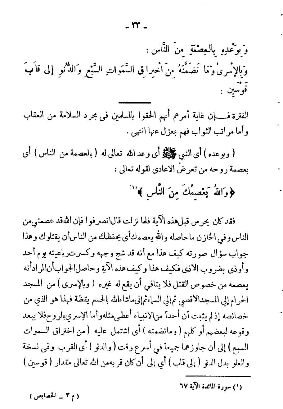 وبوعده بالعصمة من الناس، وبالإسراء وما تضمنه من اختراق السموات السبع والعلو إلى قاب قوسين،