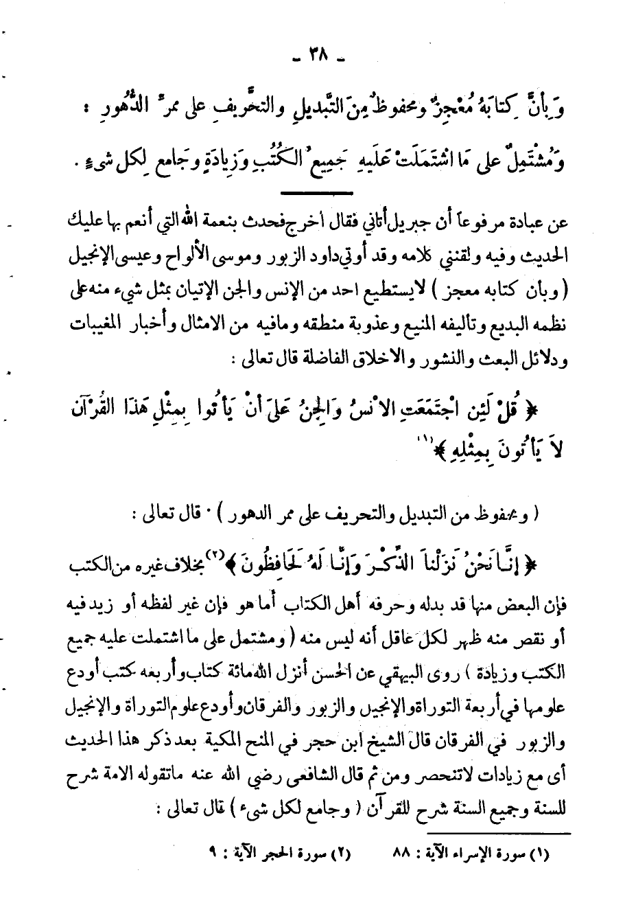 لا يقرأ ولا يكتب، وبأن كتابه مُعجِزٌ ومحفوظ من التبديل والتحريف على ممر الدهور، ومشتمل على ما اشتملت عليه جميع الكتب وزيادة، وجامع لكل شيء،