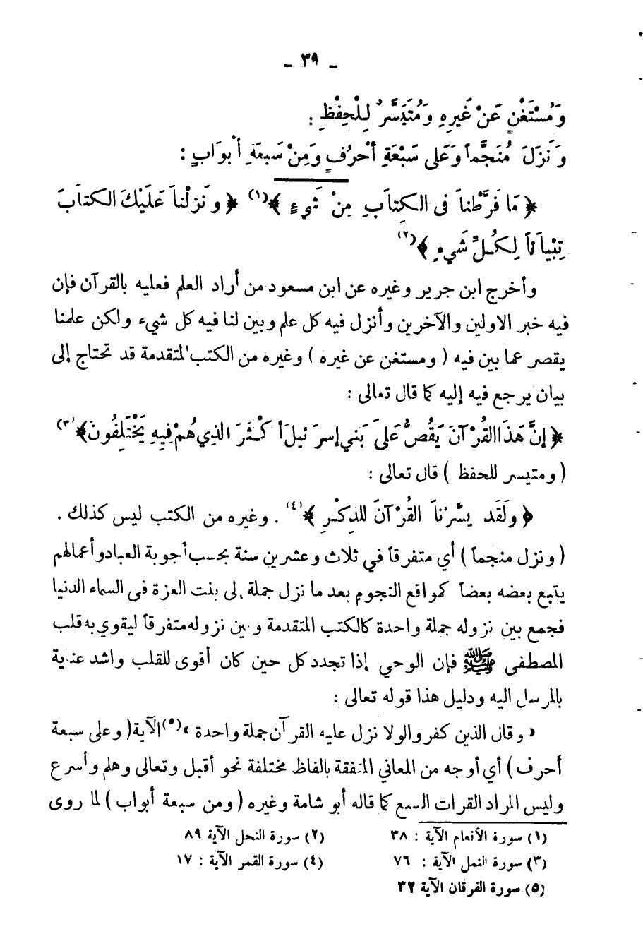 ومستغن عن غيره، ومُيسر للحفظ، ونزل منجماً، وعلى سبعة أحرف، ومن سبعة أبواب،
