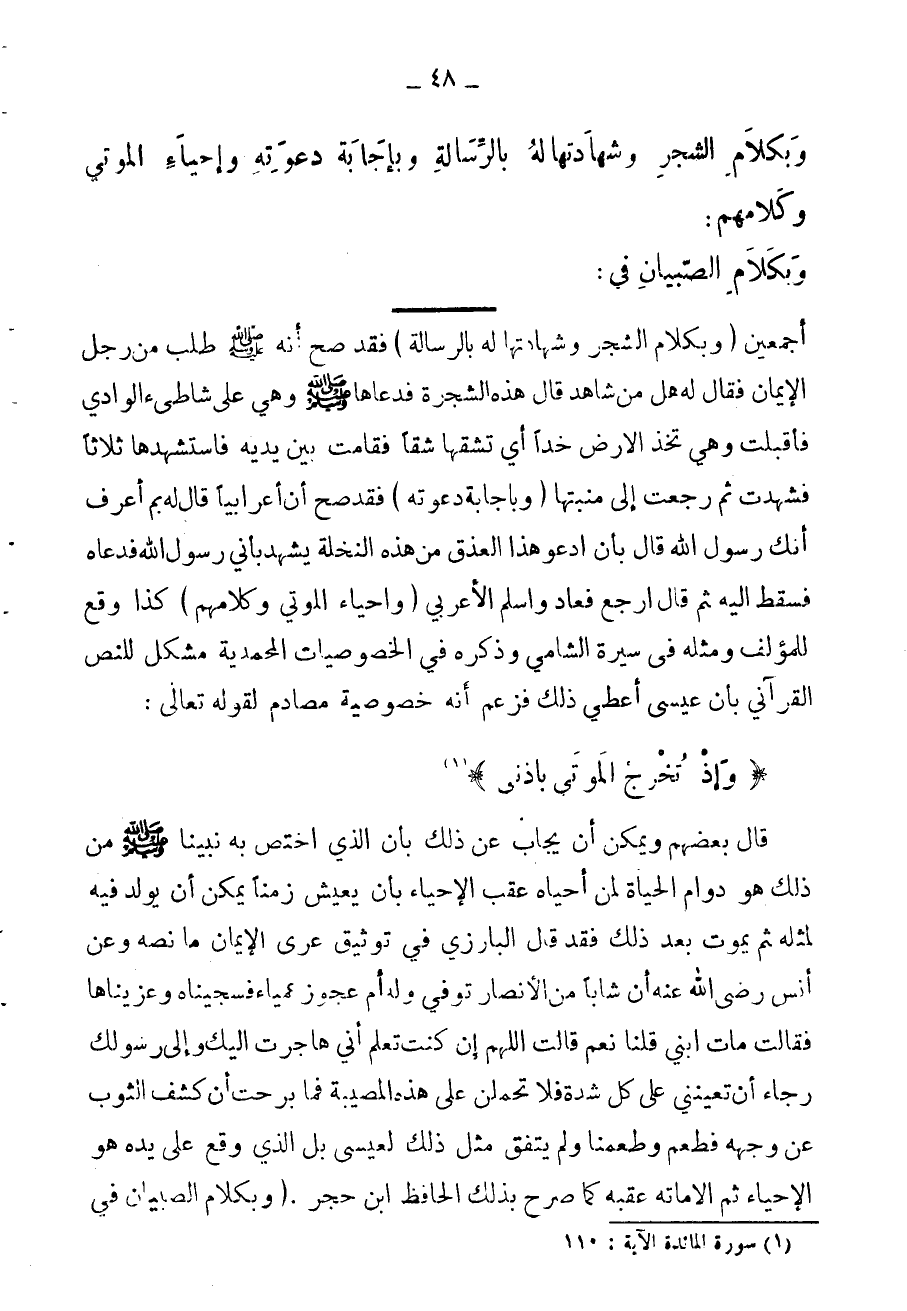 وبكلام الشجر وشهادتها له بالنبوة وإجابتها دعوته، وإحياء الموتى وكلامهم، وكلام الصبيان في
