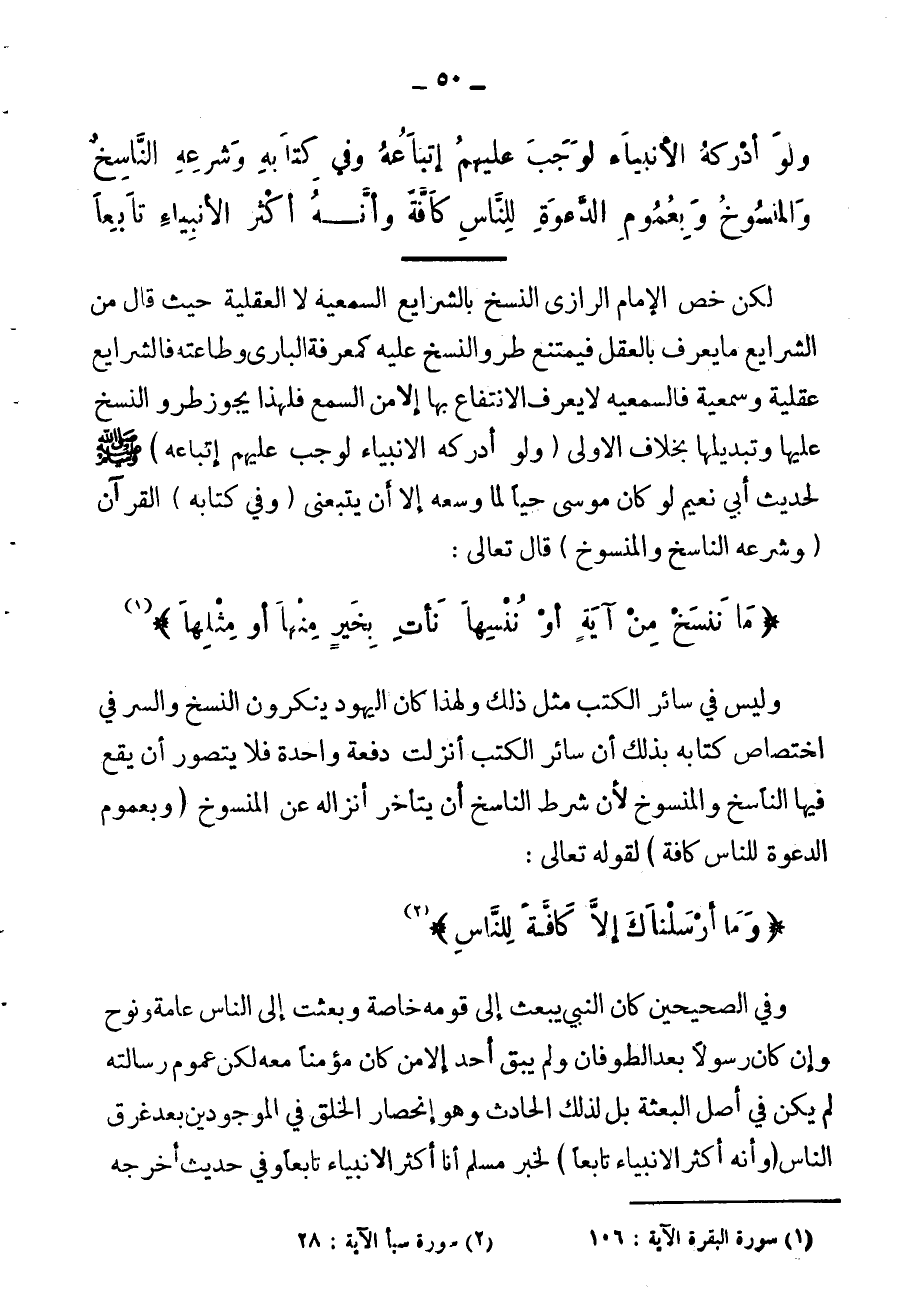 ولو أدركه الأنبياء لوجب عليهم الاتباع، وفي كتابه وشرعه الناسِخ والمنسوخ، وبعموم الدعوة للناس كافة، وأنه أكثر الأنبياء تابعاً.