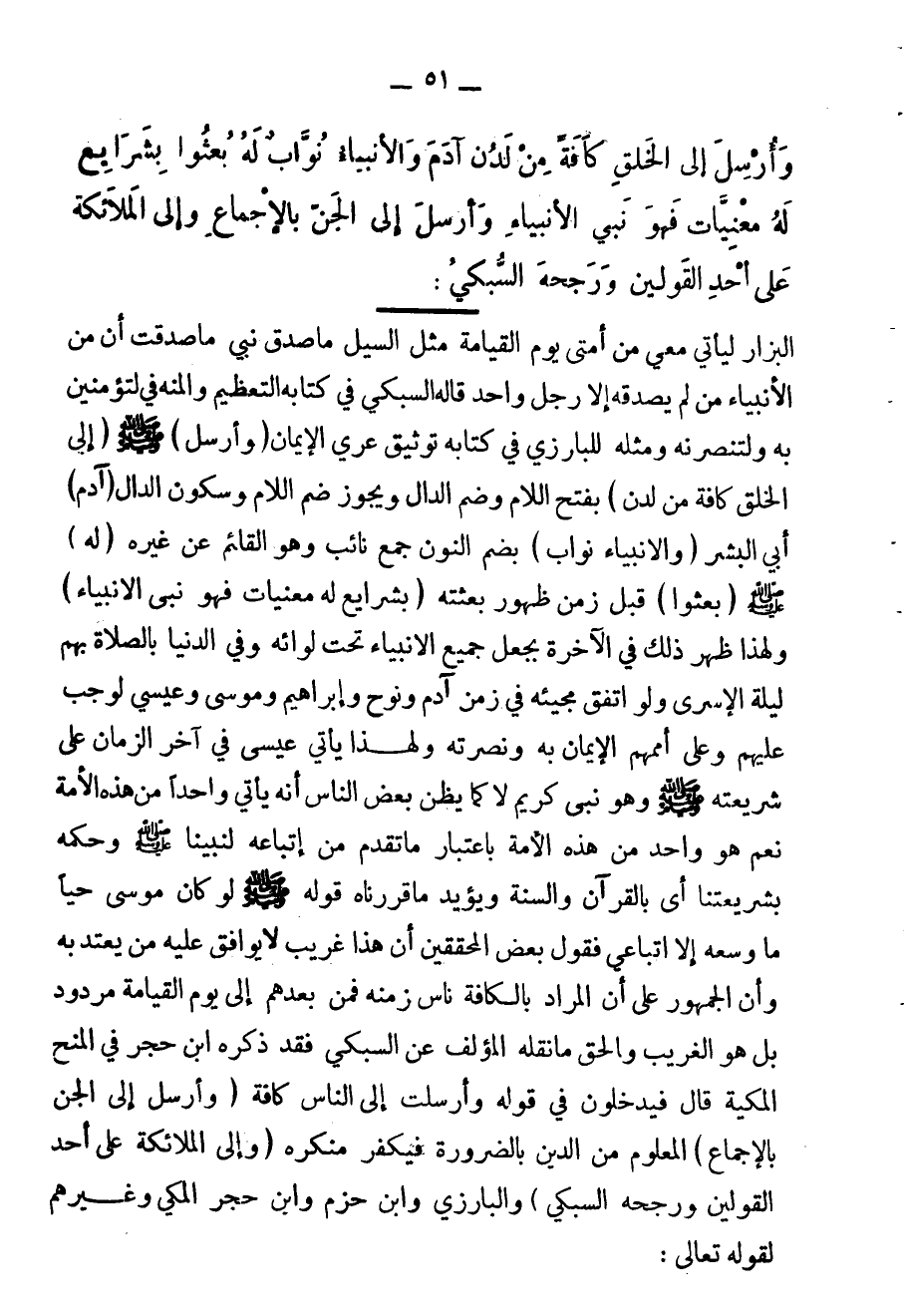 وقال السبكي: أُرسل للخلق كافة من لدن آدم، والأنبياء نواب له بعثوا بشرائع له مُعْنِيَّات، فهو نبي الأنبياء، وأرسل إلى الجن بالإجماع، وإلى الملائكة في أحد القولين، ورجحه السبكي.