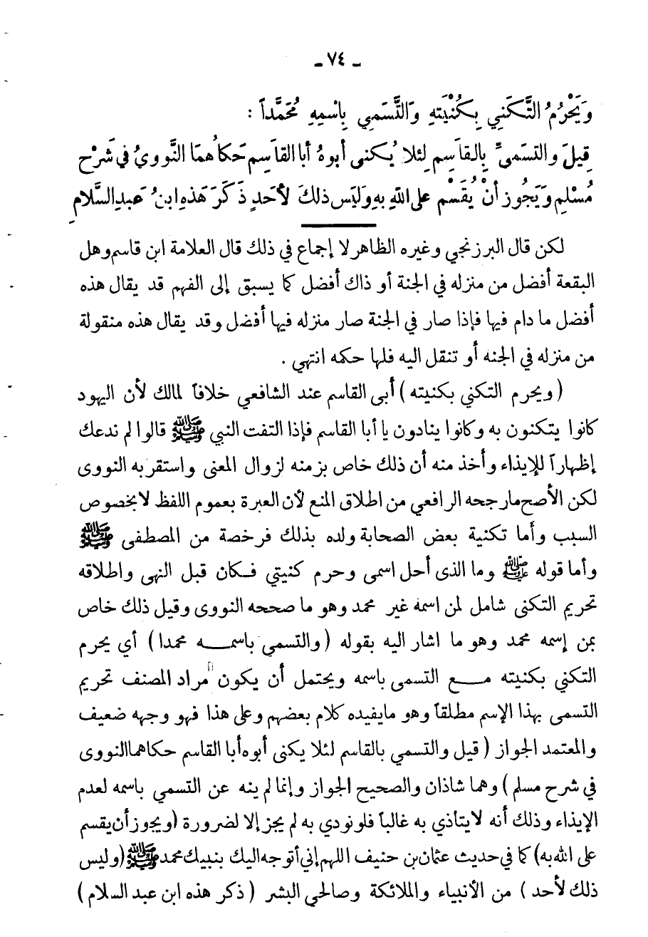 ويُحرم التكني بكنيته، وقيل: التسمي باسمه محمداً صلى الله عليه وآله وسلم، قيل والتسمي بالقاسم، لئلا يُكنى أبوه أبا القاسم. حكاها النووي في "شرح مسلم".