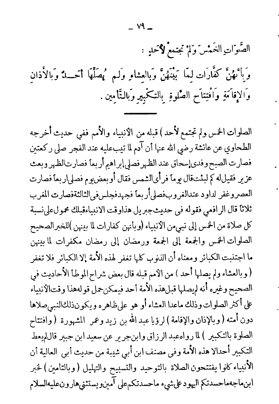 والحجر، وبمجموع الصلوات الخمس ولم تجمع لأحد وبأنهن كفارات لما بينهن، وبالعِشاءَ ولم يصلها أحد، وبالأذان والإقامة، وافتتاح الصلاة بالتكبير، وبالتأمين