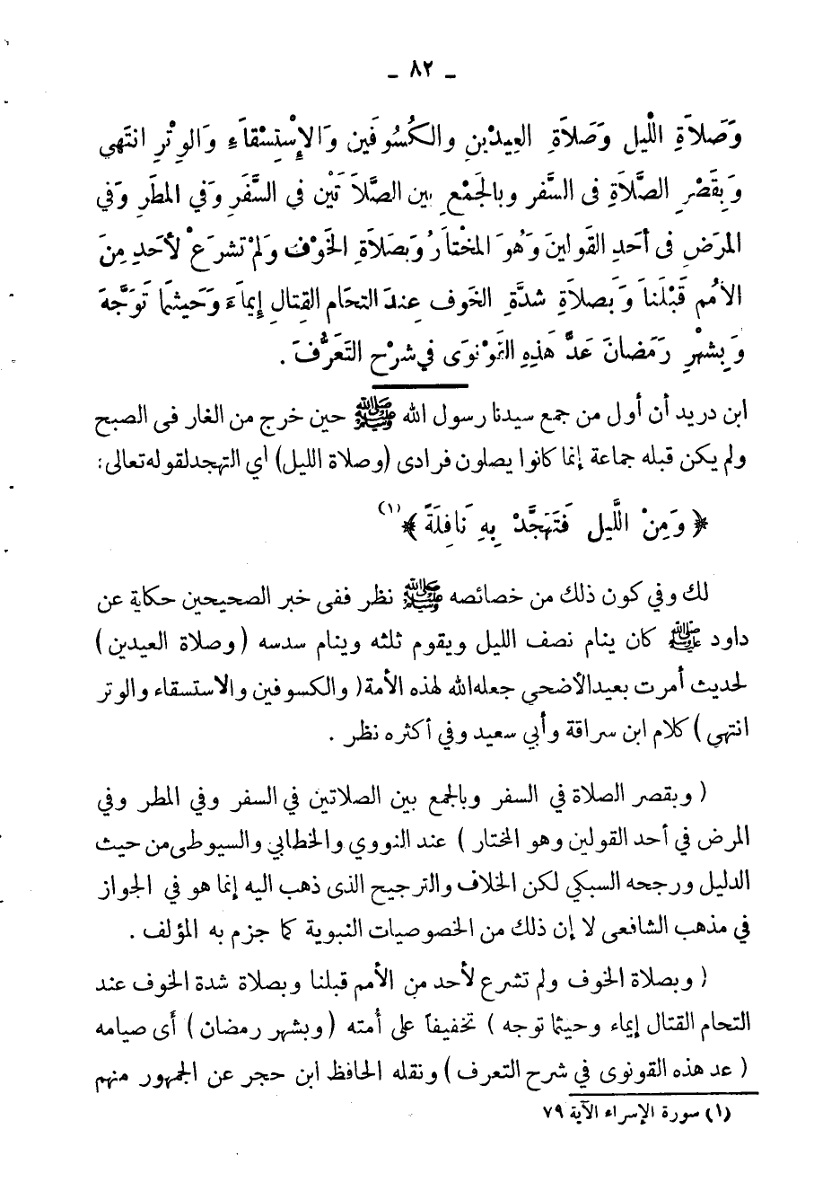 وبصلاة الخوف، فلم تشرع لأحد من الأمم قبلنا، وبصلاة شدة الخوف عند شدة القتال، أينما وحيثما توجه، وبشهر رمضان، عدَّ هذه القونوي في "شرح التعرف".