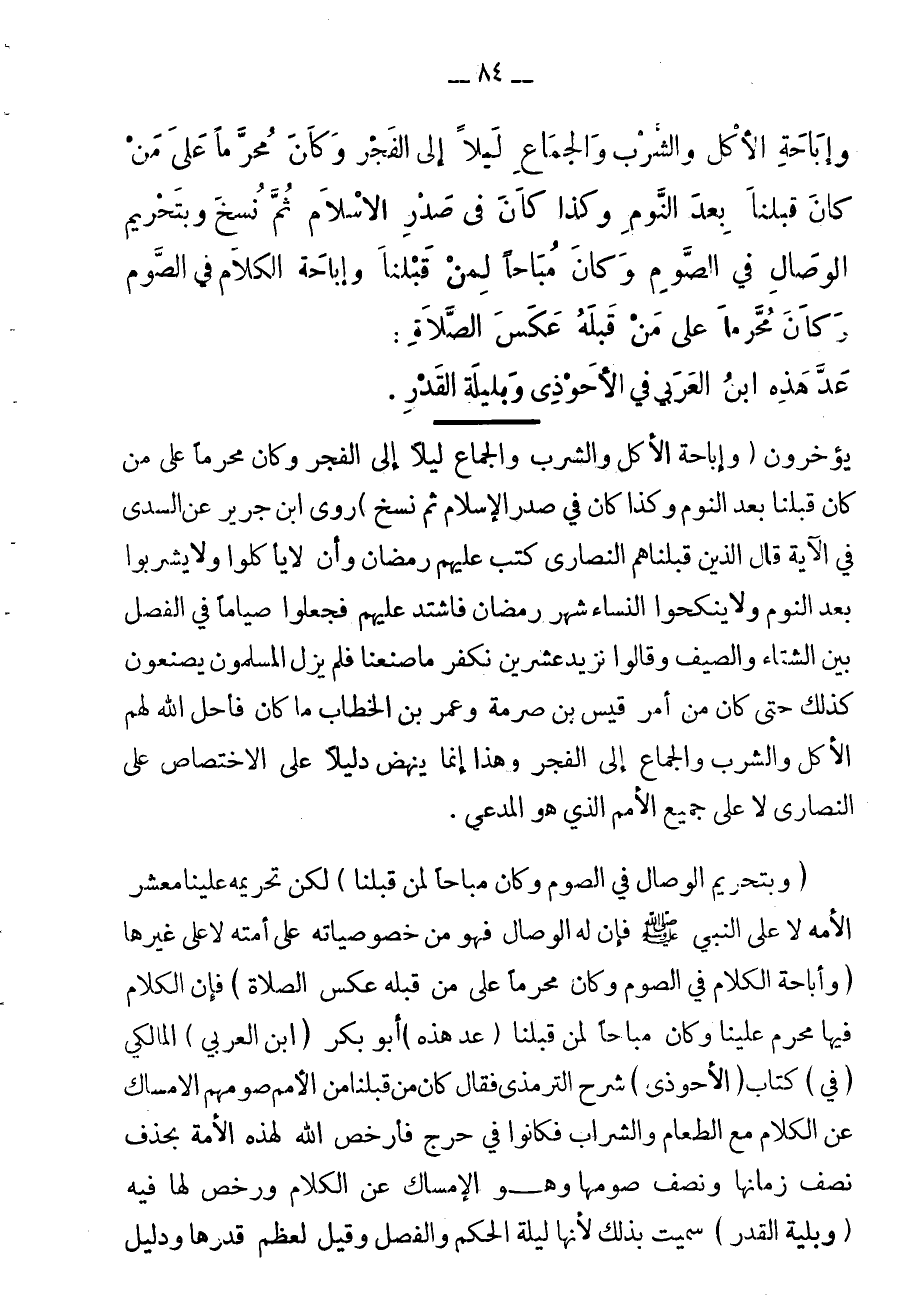 وإباحة الأكل والشرب والجماع ليلاً إلى الفجر، وكان محرماً على من قبلنا بعد النوم، وكذا كان في صدر الإسلام ثم نُسِخ، وبتحريم الوصال في الصوم، وكان مباحاً لمن قبلنا، وبإباحة الكلام في الصوم، وكان محرماً على من قبلنا، عكس الصلاة. عدَّ هذه ابن العربي في "الأحوذي".