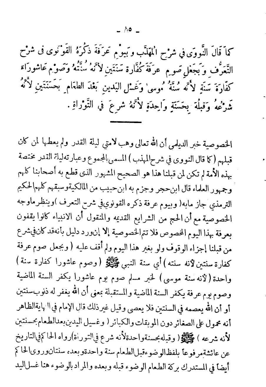 كما قاله النووي في "شرح المهذب". وبجعل صوم يوم عرفة بكفارة سنتين لأنه سُنَّته، وصوم عاشوراء كفارة سنة، لأنة سُنَّة موسى عليه السلام. ويوم عرفة ذكرها القونوي في "شرح التعرف".