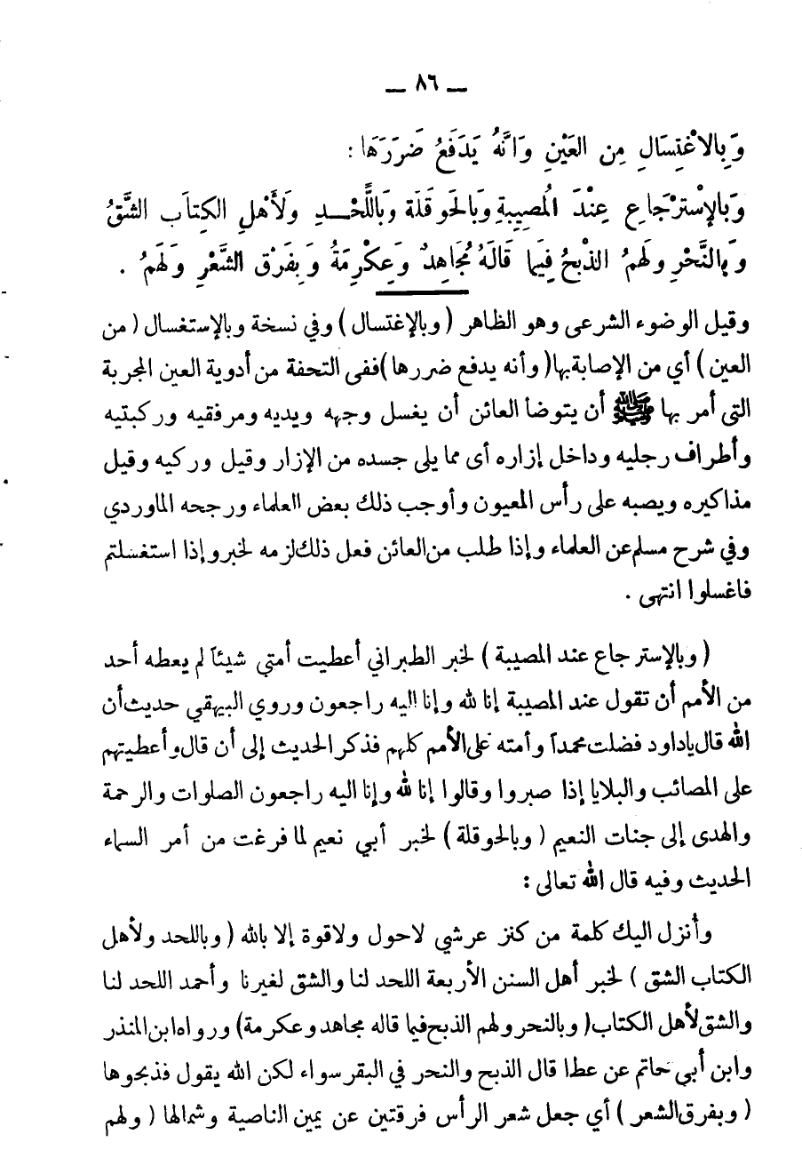 وبالاستغسال من العين وأنه يدفع ضررها. وبالاسترجاع عند المصيبة، وبالحوقلة، وباللحد (في القبر) ، ولأهل الكتاب الشق، وبالنحر، ولهم الذبح فيما قاله مجاهد وعكرمة.