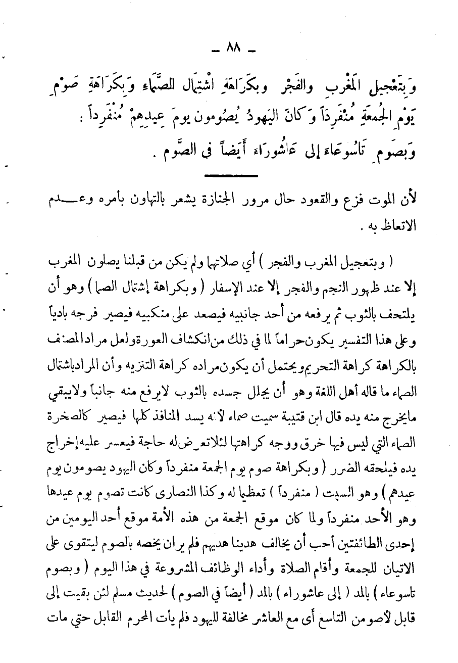 وبتعجيل المغرب والفجر، وبكراهة اشتمال الصماء، وبكراهة صوم يوم الجمعة منفرداً، وكان اليهود يصومون يوم عيدهم منفرداً، وبضم تاسوعاء إلى عاشوراء في الصوم،