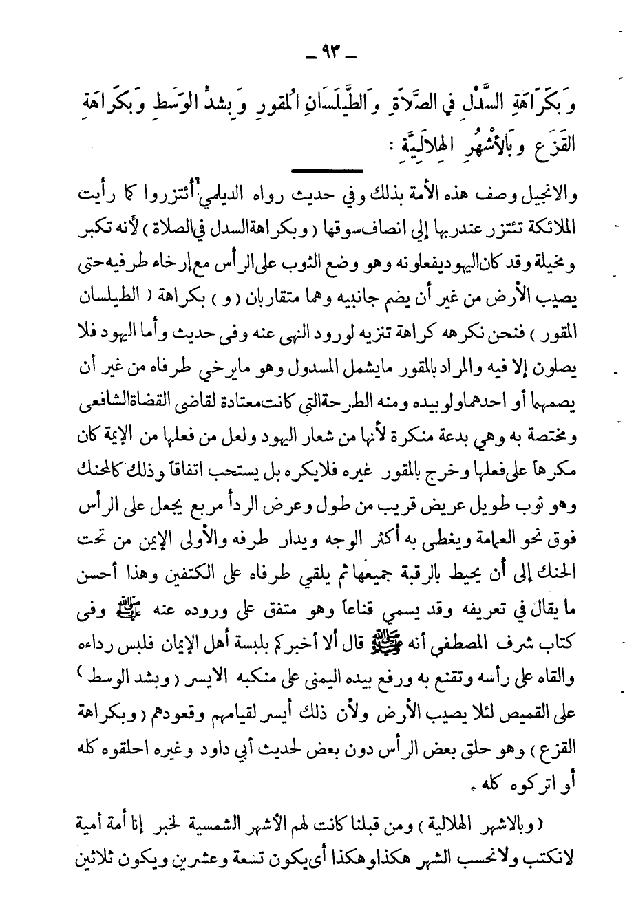 وبكراهة السدل في الصلاة والطيلسان المقور، وشد الوسط على القميص، والقزع، وبالأشهر الهلالية،