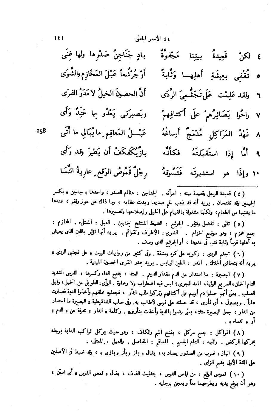 4 - (لكِنْ قَعِيدَةُ بَيتِنَا مَجْفُوَّةٌ ... بادٍ جَناجِنُ صَدْرِها وَلها غنى)