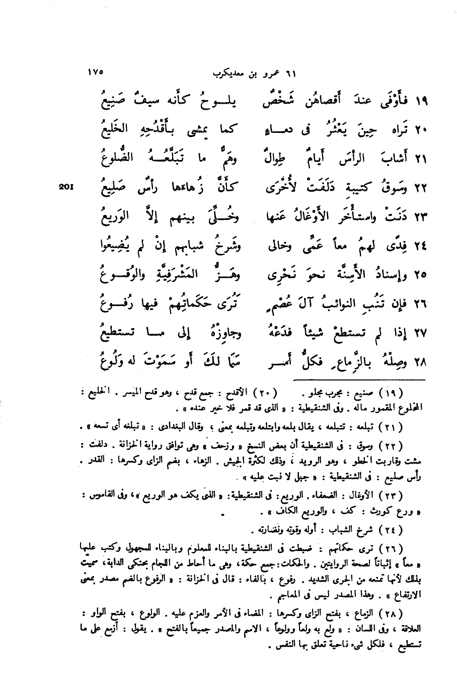 20 - (ترَاهُ حينَ يَعثُرُ فِي دماءٍ ... كمَا يمشِي بأقدُحِهِ الخَليعُ)