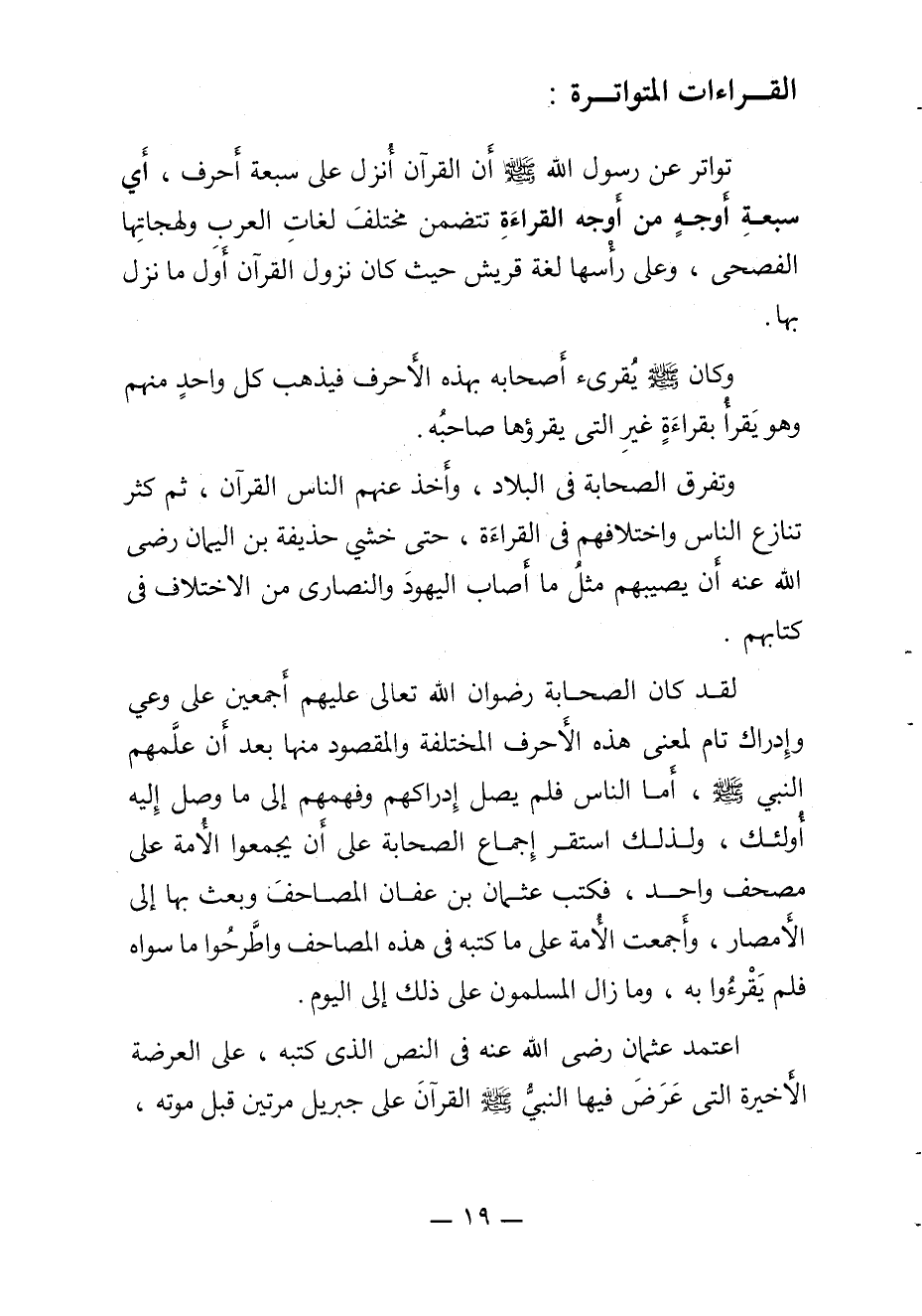 تواتر عن رسول الله -صلى الله عليه وسلم- "أن القرآن أنزل على سبعة أحرف" -أي: سبعة أوجه من أوجه القراءة- تتضمن مختلف لغات العرب ولهجاتها الفصحى، وعلى رأسها لغة قريش حيث كان نزول القرآن أول ما نزل بها.
