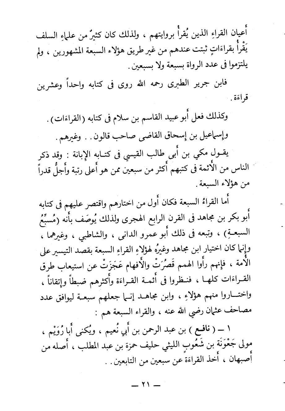 فابن جرير الطبري -رحمه الله- روى في كتابه واحدًا وعشرين قراءة.