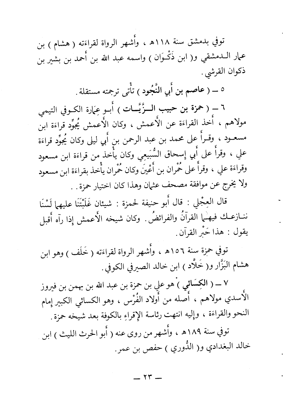 6 حمزة بن حبيب الزيات أبو عمارة الكوفي التيمي مولاهم، أخذ القراءة عن الأعمش، وكان الأعمش يجود قراءة ابن مسعود، وقرأ على محمد بن عبد الرحمن بن أبي ليلى وكان يجود قراءة علي، وقرأ على أبي إسحاق السبيبعي وكان يأخذ من قراءة ابن مسعود وقراءة علي، وقرأ على حمران بن أعين وكان حمران يأخذ بقراءة ابن مسعود ولا يخرج عن موافقة مصحف عثمان وهذا كان اختيار حمزة.