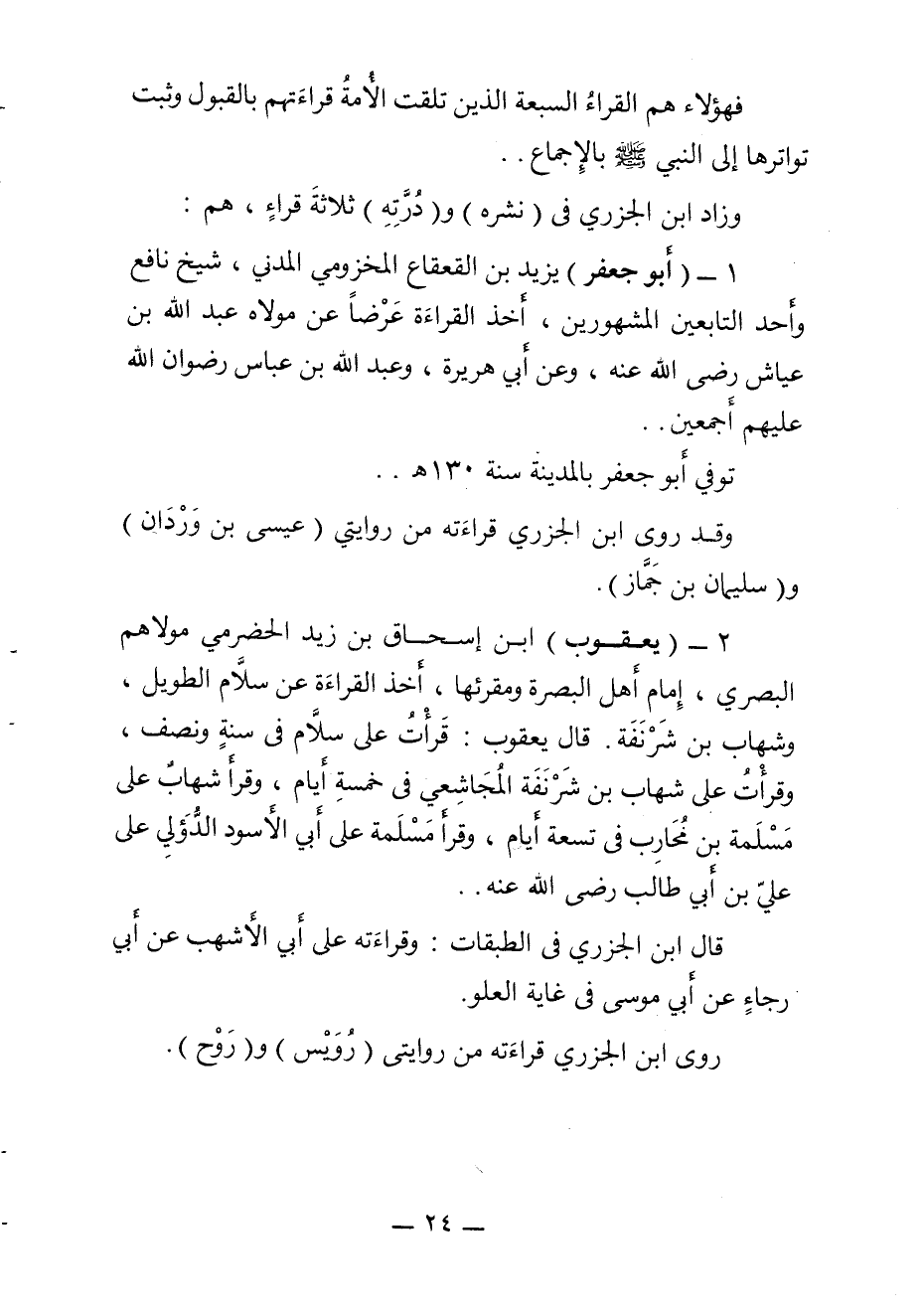 1 أبو جعفر يزيد بن القعقاع المخزومي المدني، شيخ نافع وأحد التابعين المشهورين، أخذ القراءة عرضًا عن مولاه عبد الله بن عياش -رضي الله عنه- وعن أبي هريرة، وعبد الله بن عباس، رضوان الله عليهم أجمعين.