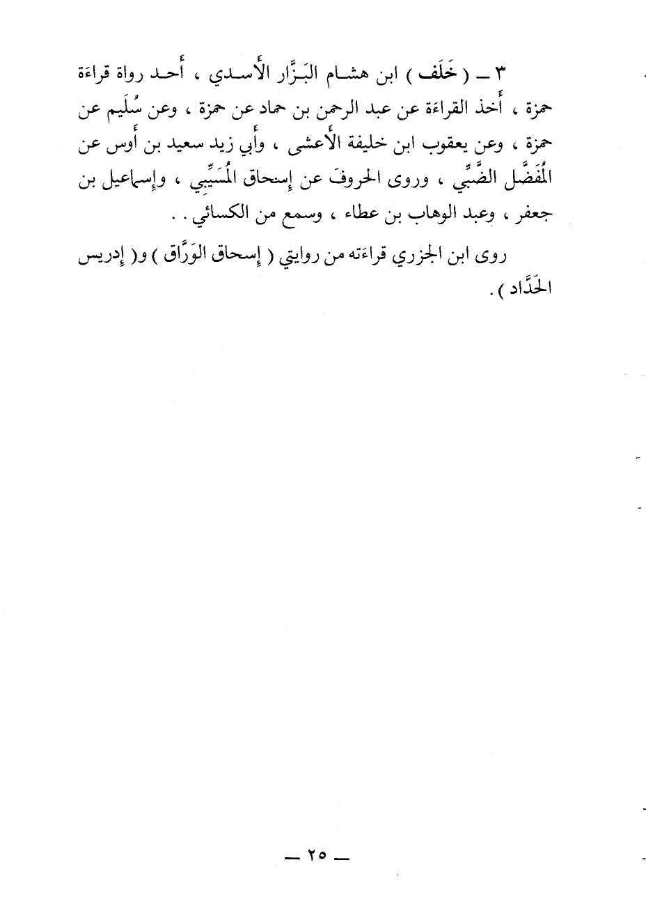 3 خلف بن هشام البزار الأسدي، أحد رواة قراءة حمزة، أخذ القراءة عن عبد الرحمن بن حماد عن حمزة، وعن سليم عن حمزة، وعن يعقوب بن خليفة الأعشى، وأبي زيد سعيد بن أوس عن المفضل الضبي، وروى الحروف عن إسحاق المسيبي، وإسماعيل بن جعفر، وعبد الوهاب بن عطاء، وسمع من الكسائي.