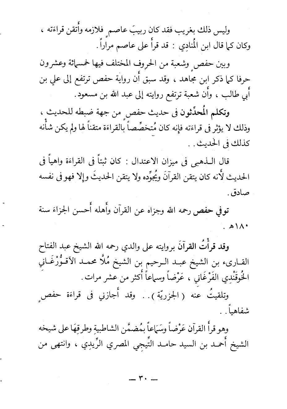 وتكلم المحدثون في حديث حفص من جهة ضبطه للحديث، وذلك لا يؤثر في قراءته فإنه كان متخصصًا بالقراءة متقنا لها ولم يكن شأنه كذلك في الحديث.