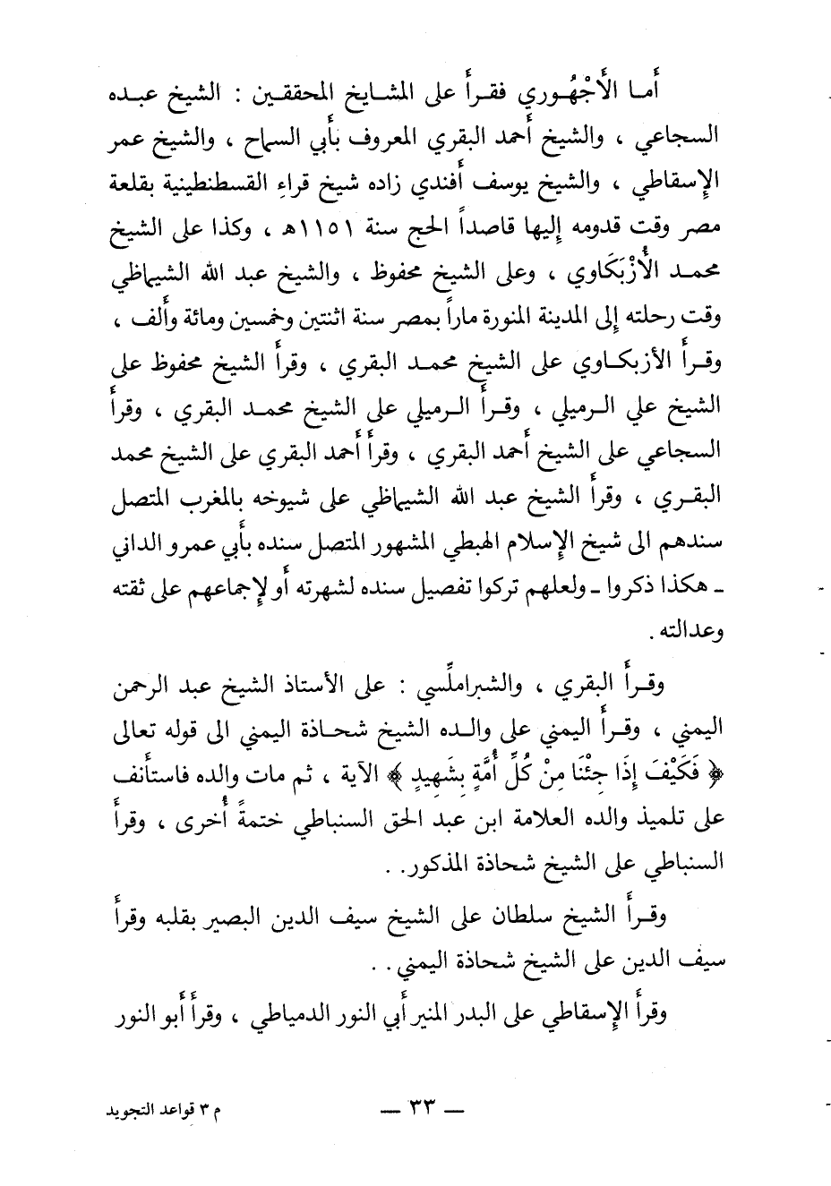 وقرأ البقري، والشبراملسي: على الأستاذ الشيخ عبد الرحمن اليمني، وقرأ اليمني على والده الشيخ شحاذة اليمني إلى قوله تعالى: {فَكَيْفَ إِذَا جِئْنَا مِنْ كُلِّ أُمَّةٍ بِشَهِيدٍ} الآية، ثم مات والده فاستأنف على تلميذ والده العلامة ابن عبد الحق السنباطي ختمة أخرى، وقرأ السنباطي على الشيخ شحاذة المذكور.