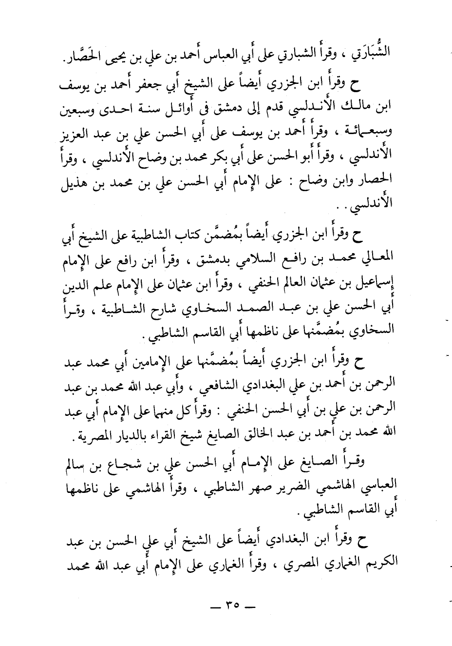 ح وقرأ ابن الجزري أيضًا على الشيخ أبي جعفر أحمد بن يوسف بن مالك الأندلسي قدم إلى دمشق في أوائل سنة إحدى وسبعين وسبعمائة، وقرأ أحمد بن يوسف على أبي الحسن علي بن عبد العزيز الأندلسي، وقرأ أبو الحسن على أبي بكر محمد بن وضاح الأندلسي، وقرأ الحصار وابن وضاح على الإمام أبي الحسن علي بن محمد بن هذيل الأندلسي.