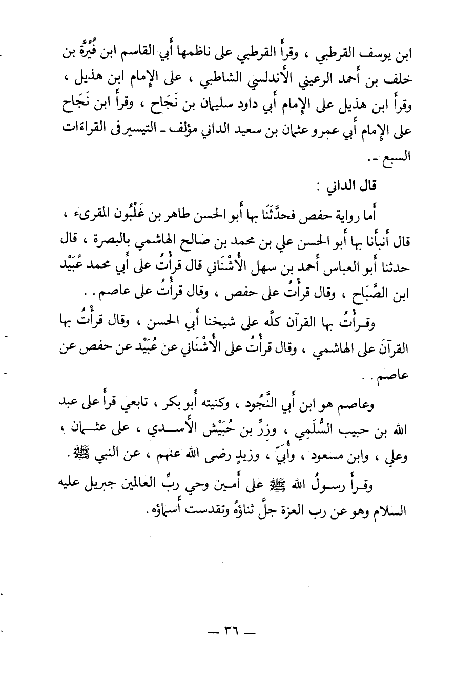 ابن يوسف القرطبي، وقرأ القرطبي على ناظمها أبي القاسم ابن فيرة بن خلف بن أحمد الرعيني الأندلسي الشاطبي، على الإمام ابن هذيل، وقرأ ابن هذيل على الإمام أبي داود سليمان بن نجاح، وقرأ ابن نجاح على الإمام أبي عمرو عثمان بن سعيد الداني مؤلف التيسير في القراءات السبع.