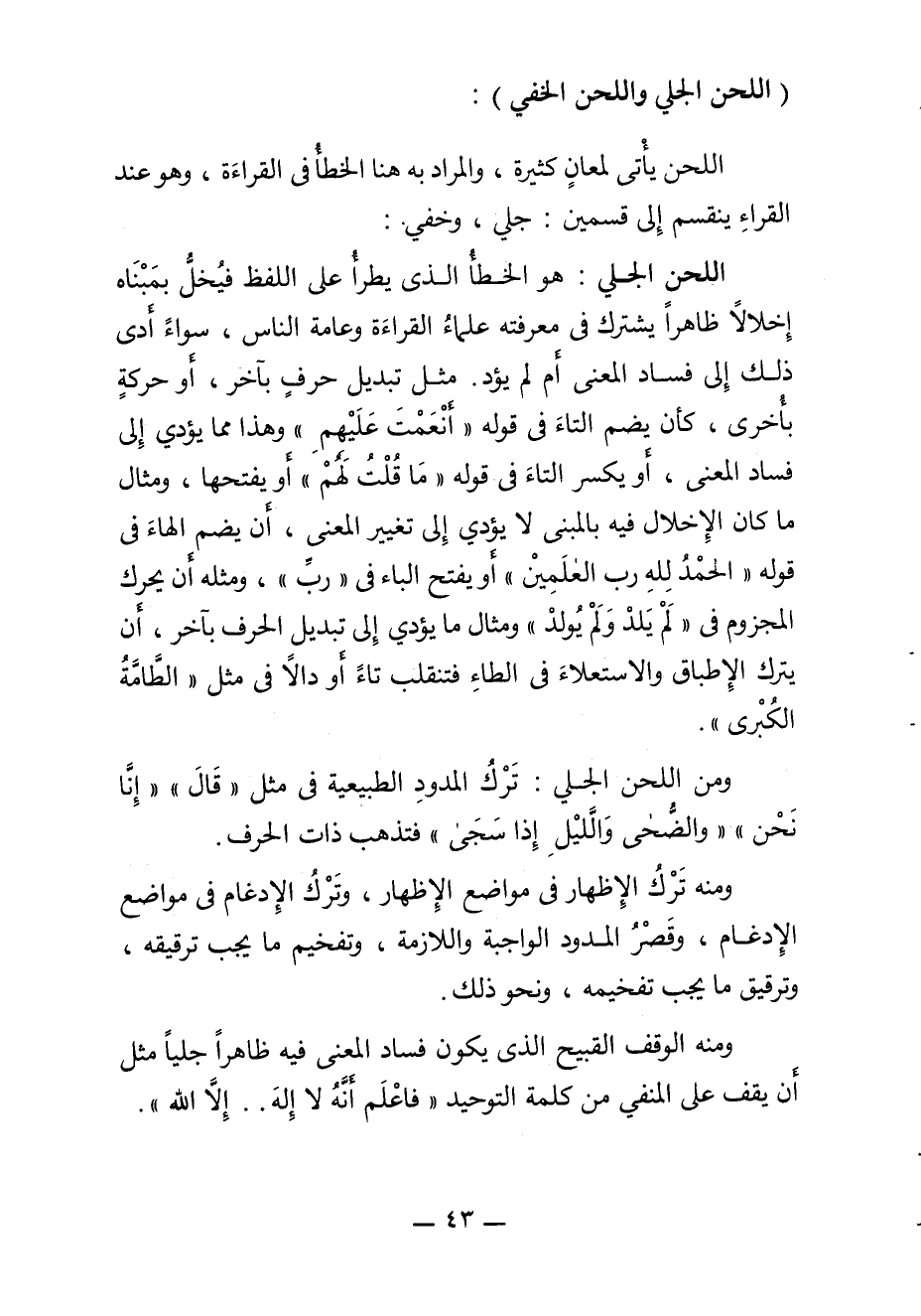 ومنه ترك الإظهار في مواضع الإظهار، وترك الإدغام في مواضع الإدغام، وقصر المدود الواجبة واللازمة، وتفخيم ما يجب ترقيقه، وترقيق ما يجب تفخيمه، ونحو ذلك.