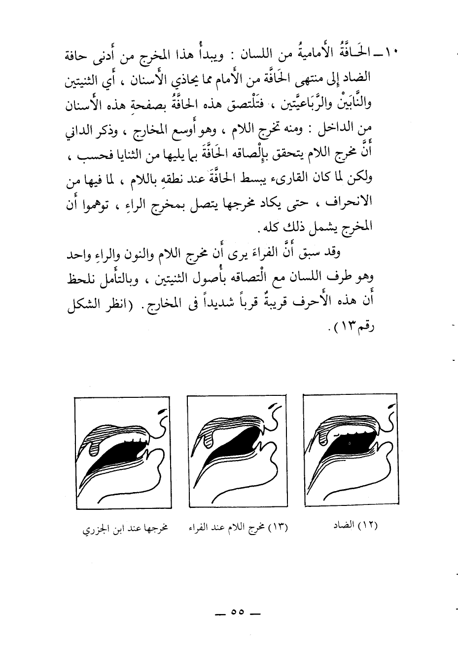 10 الحافة الأمامية من اللسان: ويبدأ هذا المخرج من أدنى حافة الضاد إلى منتهى الحافة من الأمام مما يحاذي الأسنان، أي الثنيتين والنابين والرباعيتين، فتلتصق هذه الحافة بصفحة هذه الأسنان من الداخل: ومنه تخرج اللام، وهو أوسع المخارج، وذكر الداني أن مخرج اللام يتحقق بإلصاقه الحافة بما يليها من الثنايا فحسب، ولكن لما كان القارئ يبسط الحافة عند نطقه باللام، لما فيها من الانحراف، حتى يكاد مخرجها يتصل بمخرج الراء، توهموا أن المخرج يشمل ذلك كله.