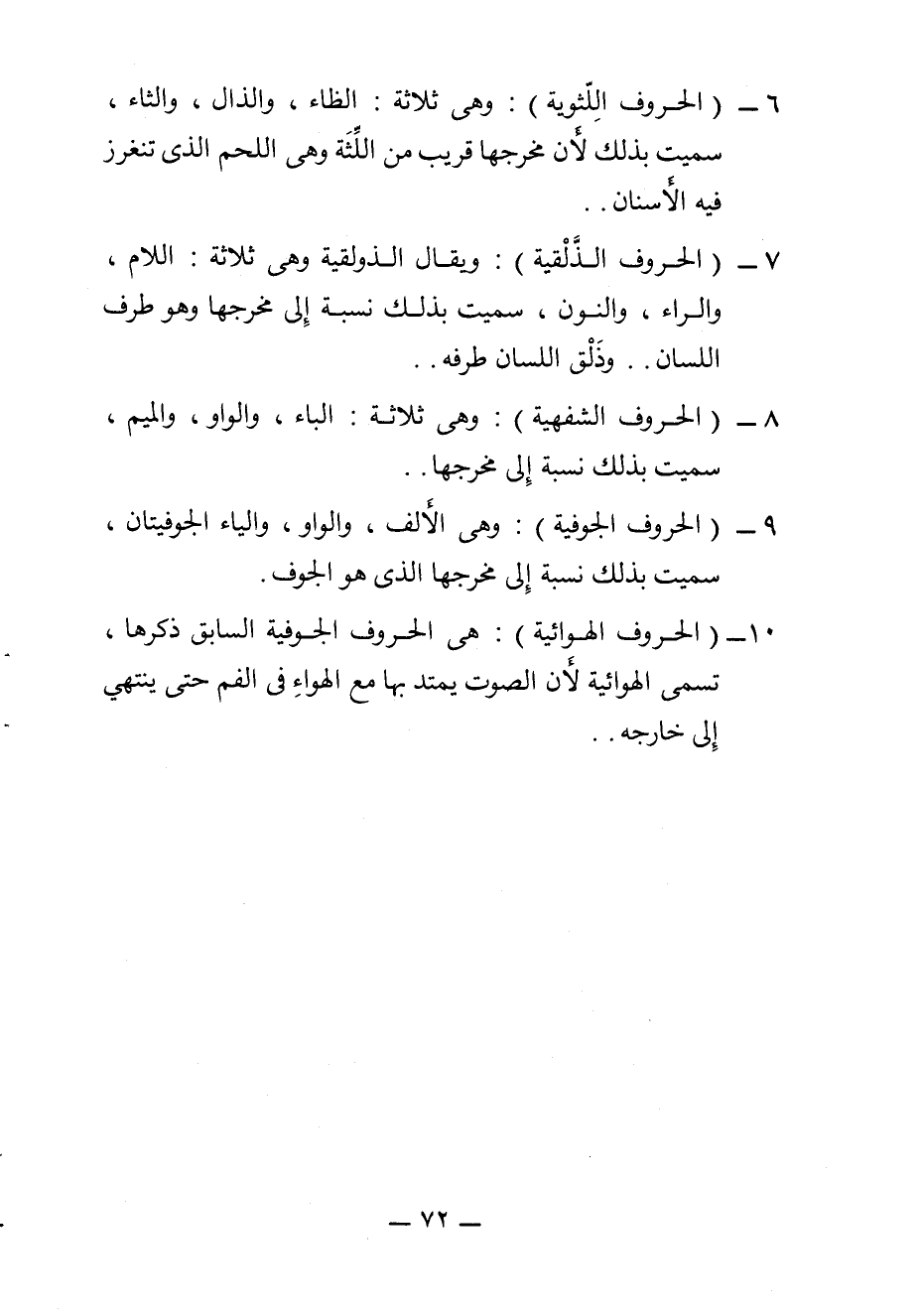 9 الحروف الجوفية: وهي الألف، والواو، والياء الجوفيتان، سميت بذلك نسبة إلى مخرجها الذي هو الجوف.