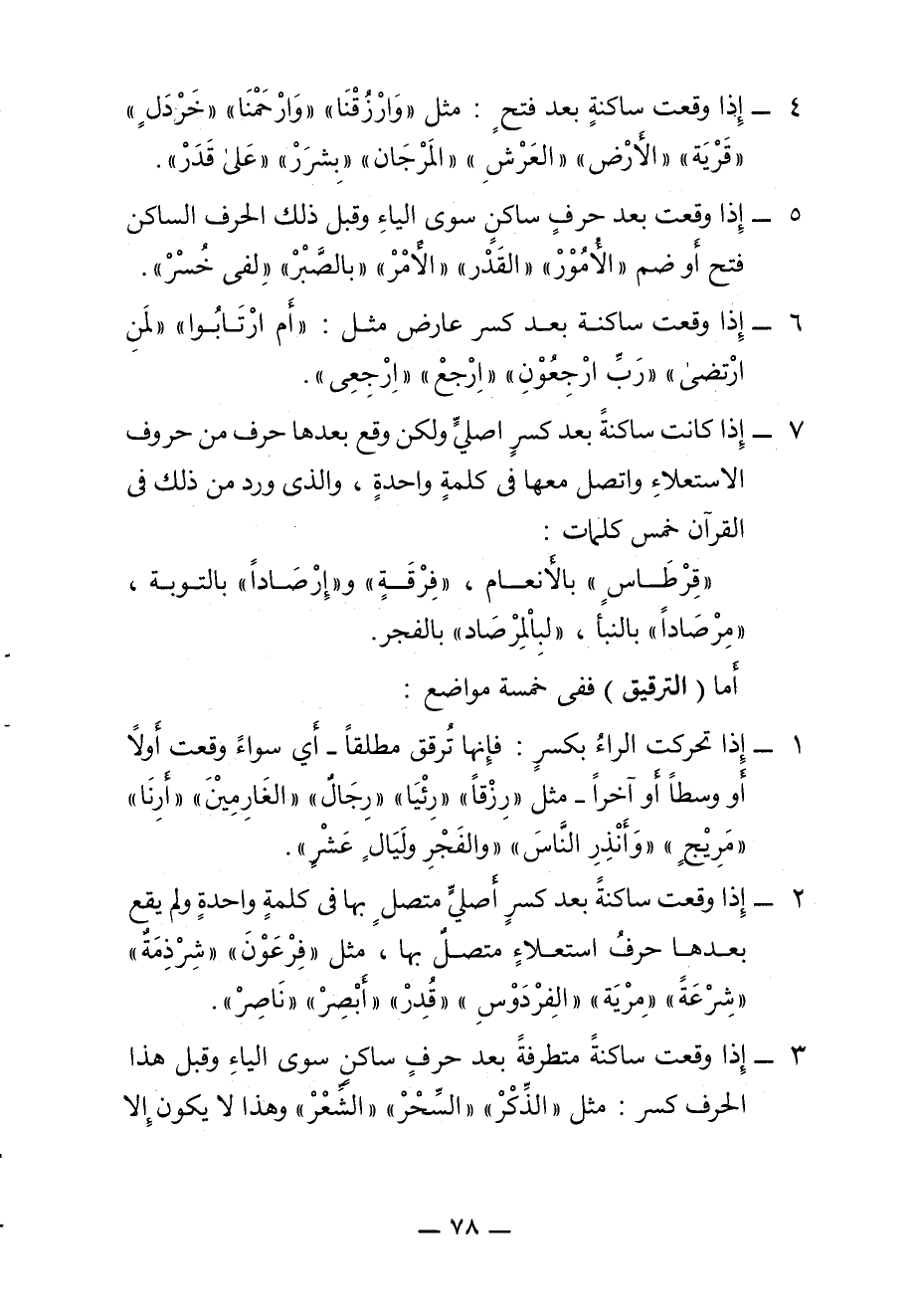 1 إذا تحركت الراء بكسر: فإنها ترقق مطلقا - أي سواء وقعت أولا أو وسطا أو آخرًا- مثل {رِزْقاً} {رِئْيا} {رِجَالٌ} {الْغَارِمِين} {أَرِنَا} {مَرِيجٍ} {وَأَنذِرِ النَّاسَ} {وَالْفَجْرِ وَلَيَالٍ عَشْرٍ} .