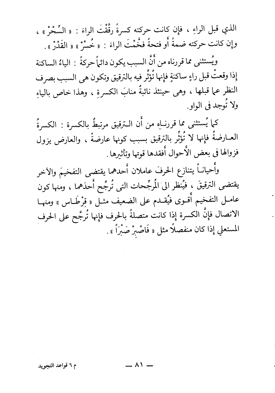 وأحيانًا يتنازع الحرف عاملان: أحدهما: يقتضي التفخيم والآخر: يقتضي الترقيق، فينظر إلى المرجحات التي ترجح أحدهما، ومنها كون عامل التفخيم أقوى فيقدم على الضعيف مثل: {قِرْطاس} ومنها الاتصال فإن الكسرة إذا كانت متصلة بالحرف فإنها ترجح على الحرف المستعلي إذا كان منفصلًا مثل {فَاصْبِرْ صَبْرًا} .
