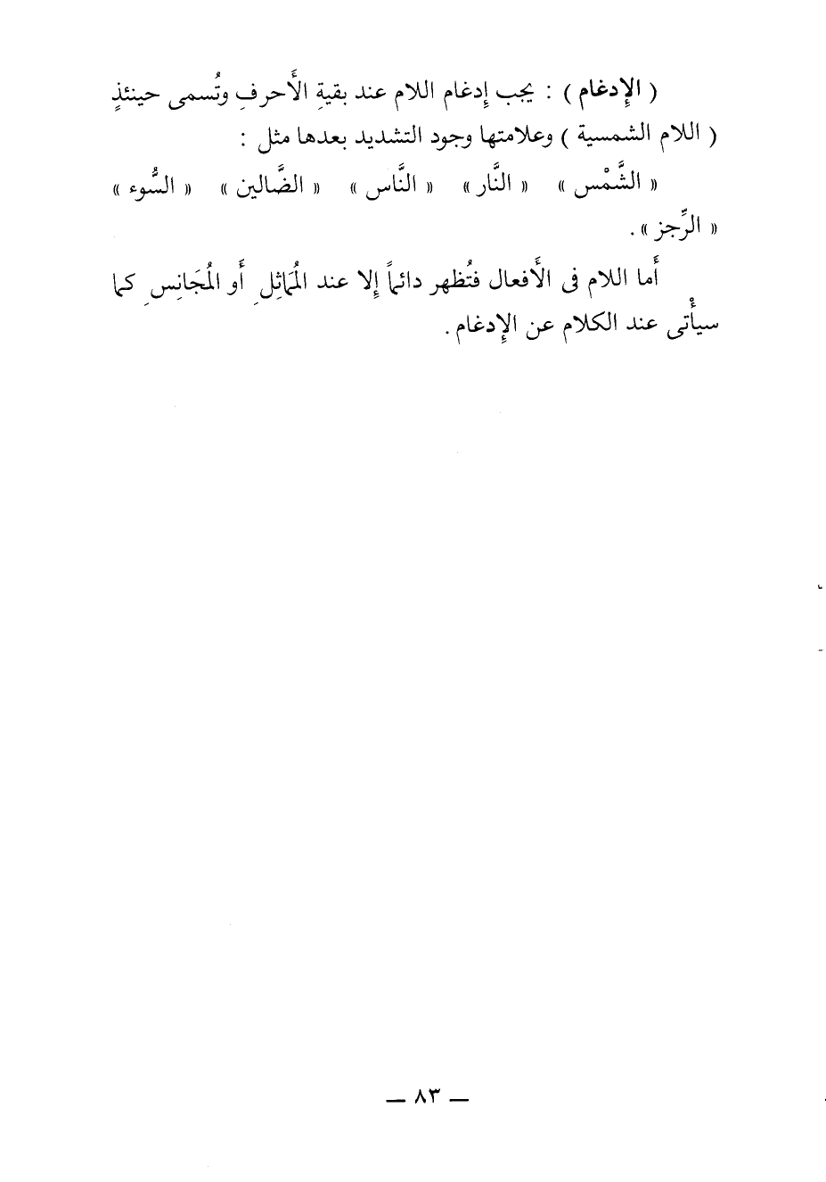 الإدغام: يجب إدغام اللام عند بقية الأحرف وتسمى حينئذ: اللام الشمسية، وعلامتها وجود التشديد بعدها مثل: