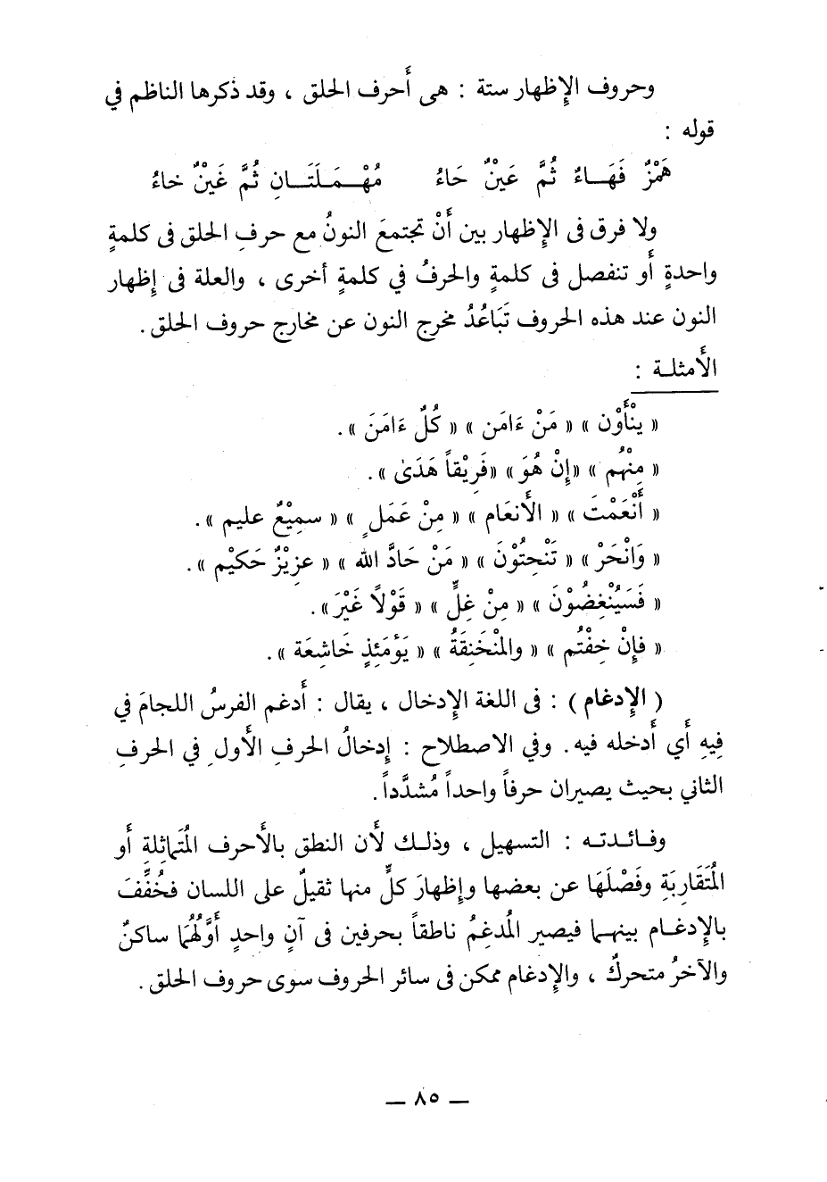 ولا فرق في الإظهار بين أن تجتمع النون مع حرف الحلق في كلمة واحدة أو تنفصل في كلمة والحرف في كلمة أخرى، والعلة في إظهار النون عند هذه الحروف تباعد مخرج النون عن مخارج حروف الحلق.