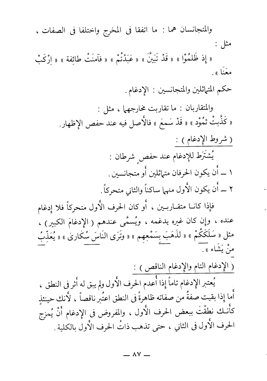 فإذا كانا متقاربين، أو كان الحرف الأول متحركًا فلا إدغام عنده، وإن كان غيره يدغمه، ويسمى عندهم الإدغام الكبير، مثل {سَلَكَكُم} {لَذَهَبَ بِسَمْعِهِم} {وَتَرَى النَّاسَ سُكَارَى} {يُعَذِّبُ مَنْ يَشَاء} .