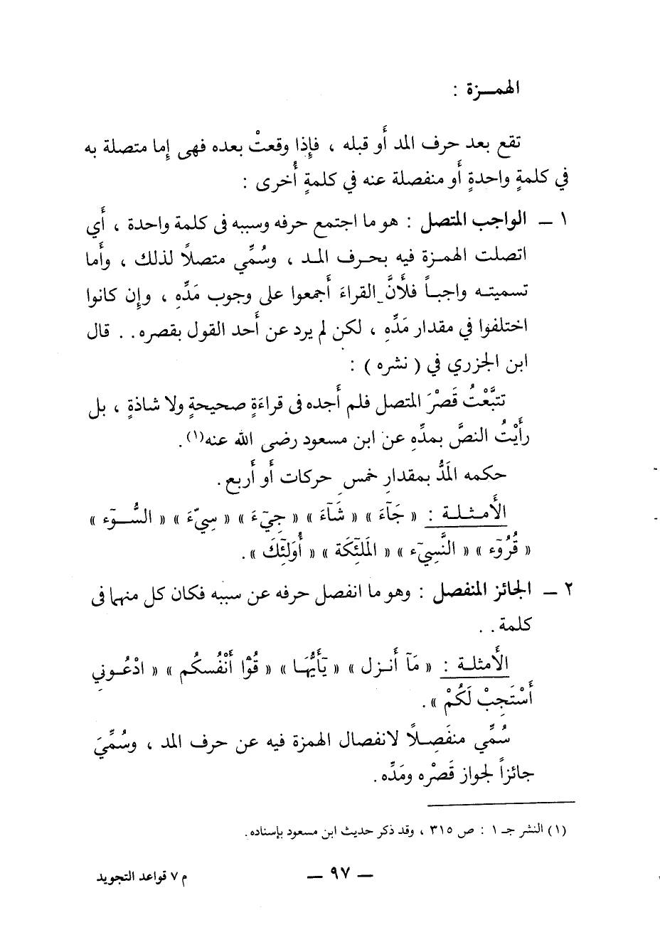 1 الواجب المتصل: هو ما اجتمع حرفه وسببه في كلمة واحدة، أي: اتصلت الهمزة فيه بحرف المد، وسمي متصلًا لذلك، وأما تسميته واجبًا فلأن القراء أجمعوا على وجوب مده، وإن كانوا اختلفوا في مقدار مده، لكن لم يرد عن أحد القول بقصره. قال ابن الجزري في نشره: