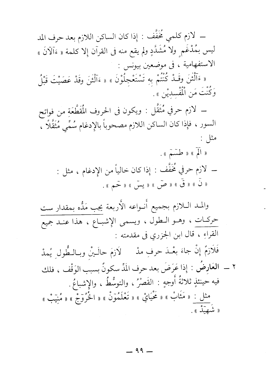- لازم كلمي مخفف: إذا كان الساكن اللازم بعد حرف المد ليس بمدغم ولا مشدد ولم يقع منه في القرآن إلا كلمة {ءَالآنَ} الاستفهامية، في موضعين بيونس: {ءَالآنَ وَقَدْ كُنْتُمْ بِهِ تَسْتَعْجِلُونَ} {ءَالآنَ وَقَدْ عَصَيْتَ قَبْلُ وَكُنْتَ مِنَ الْمُفْسِدِينَ}
