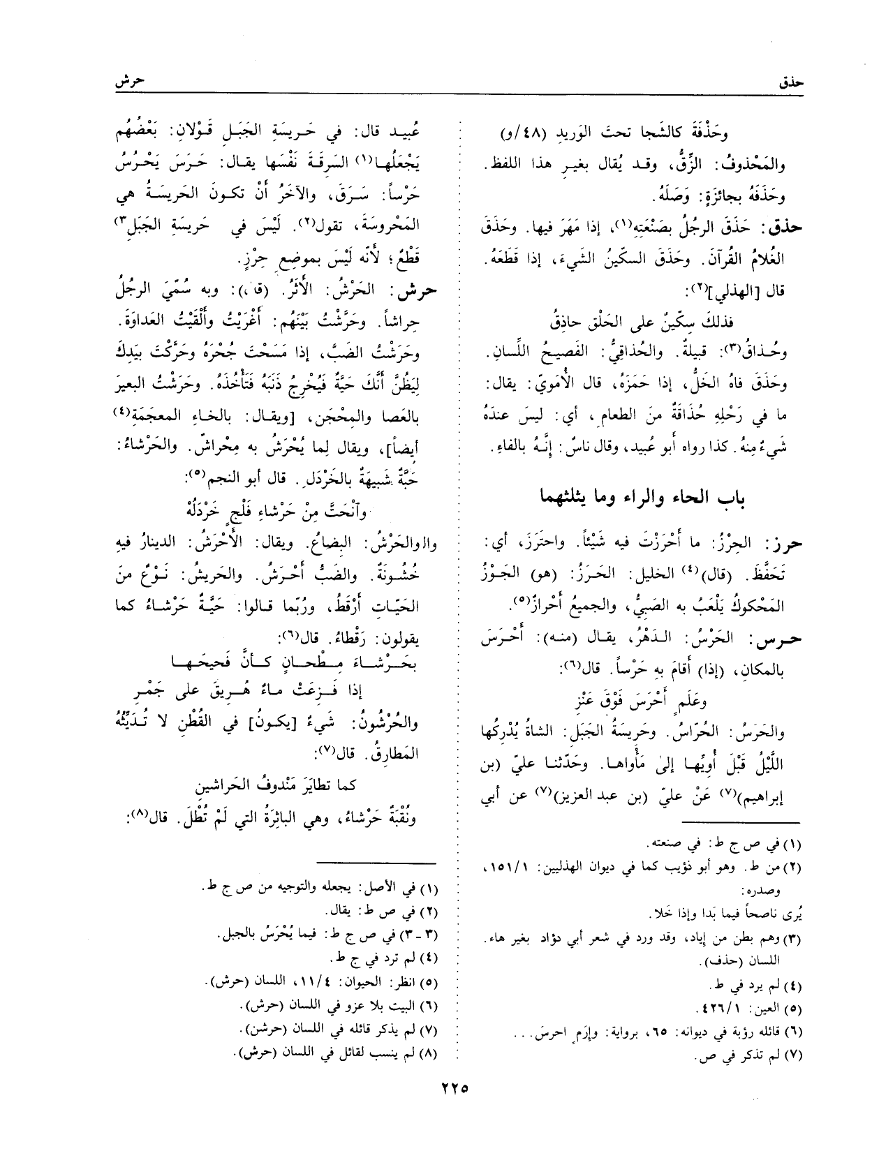 وحدثنا على (بن إبراهيم) عن علي (بن عبد العزيز) عن أبي عبيد قال: في حريسة الجبلِ قولان: بعضهم يجعلها السرقة نفسها يقال: حرس يحرس حرساً: سرق، والآخر أن تكون الحريسة هي المحروسة، تقول.