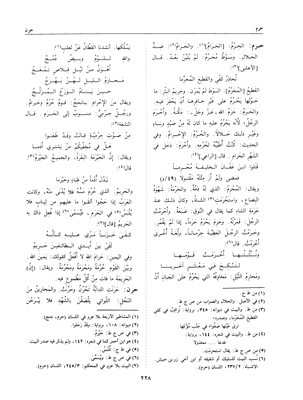 والحرمُ: حرم الله - عز وجل -: مكة وأحرمَ الرجل؛ لأنه يحرُمُ عليه ما كان له من صيدٍ ونساء وغير ذلك حلالاً.
