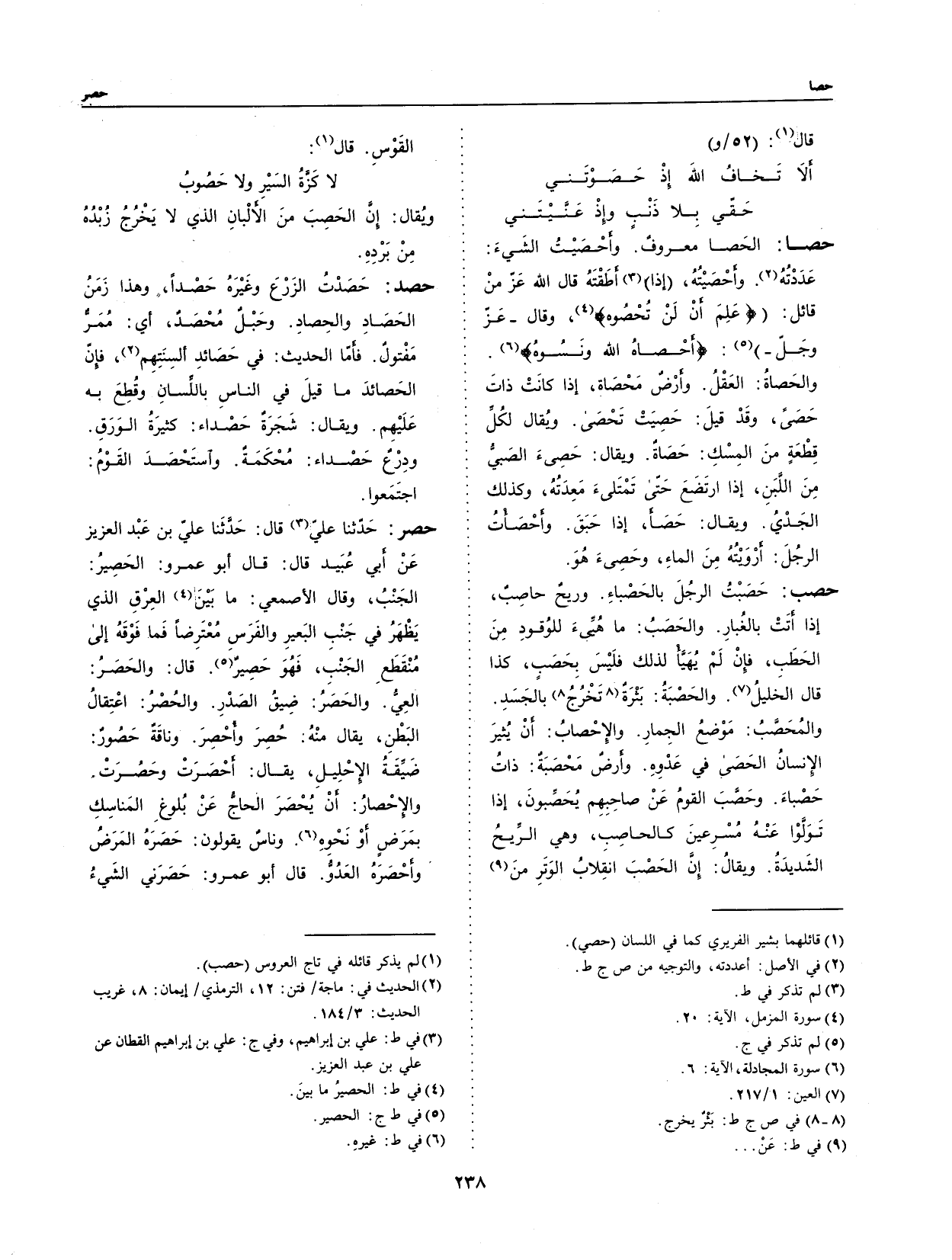 وأحصيته، (إذا) أطقتهُ قال الله عز من قائل: ( {عَلِمَ أَنْ لَنْ تُحْصُوهُ} ، وقال - عز وجل -) : {أَحْصَاهُ اللَّهُ وَنَسُوهُ} .