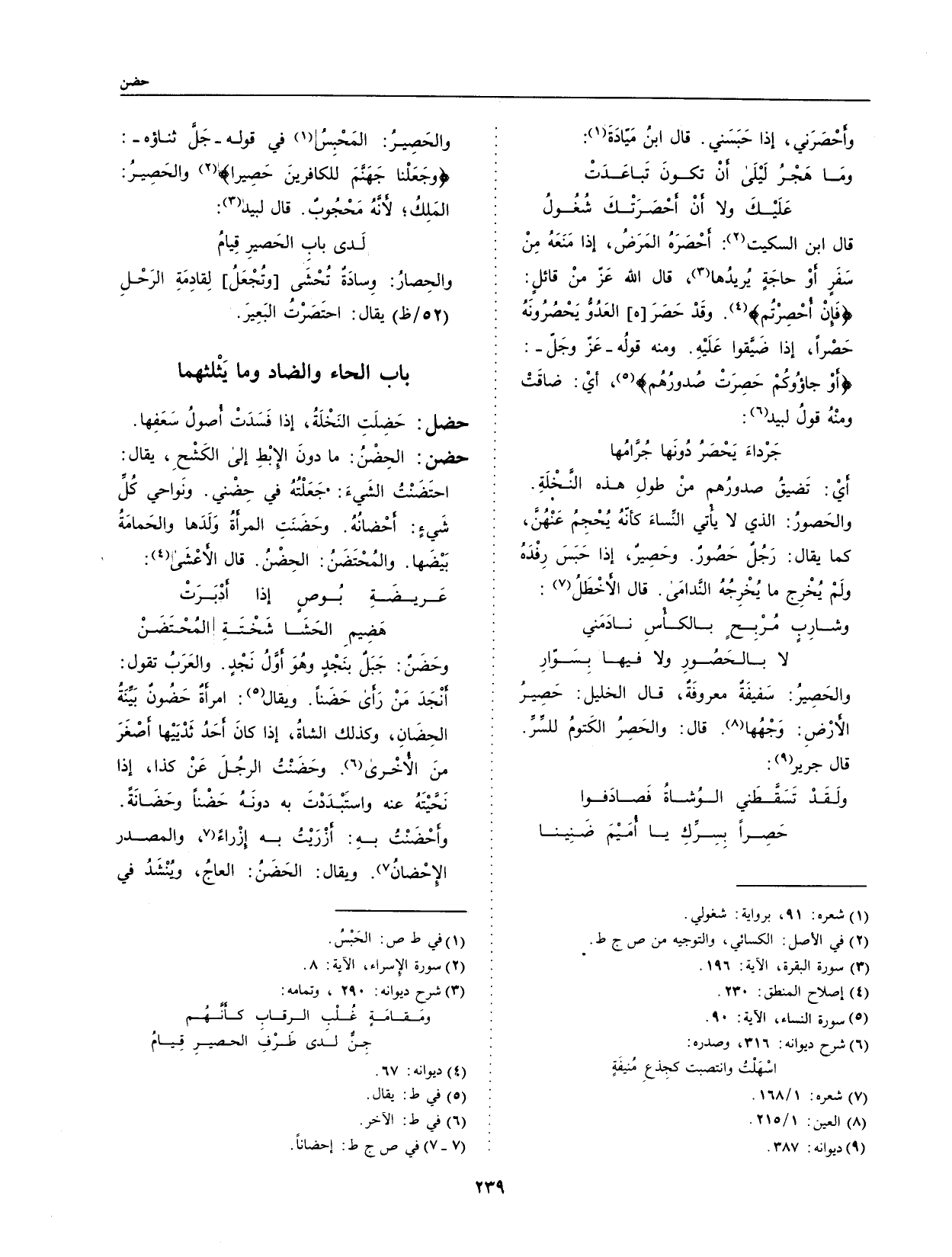 ومنه قوله - عز وجل -: {أَوْ جَاءُوكُمْ حَصِرَتْ صُدُورُهُمْ} ، أي: ضاقت ومنه قول لبيد:
